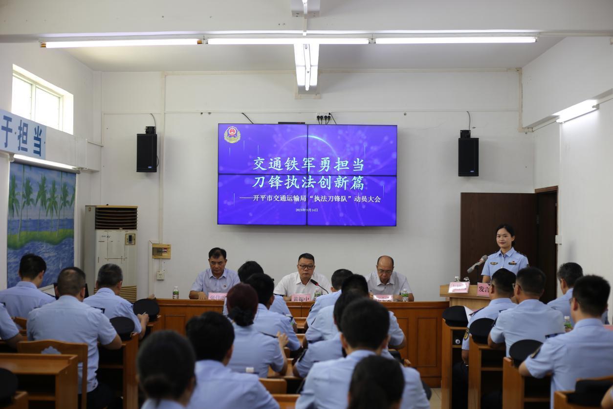 为进一步深化“2024交通执法规范年”建设,争当交通执法规范化建设排头兵,彰显交通铁军冲锋在前的担当作为,9月14日上午,市交通运输局举行执法刀锋队动员会及启动仪式。江门市交通运输局党组成员、副局长黄振中,海棠直播 办公室二级主任科员邝宝柔,海棠直播 交通运输局党组书记、局长张伟雄,江门市交通运输局、海棠直播 公安局交通警察大队以及海棠直播 交通运输局执法刀锋队全体队员参加了动员会及启动仪式。