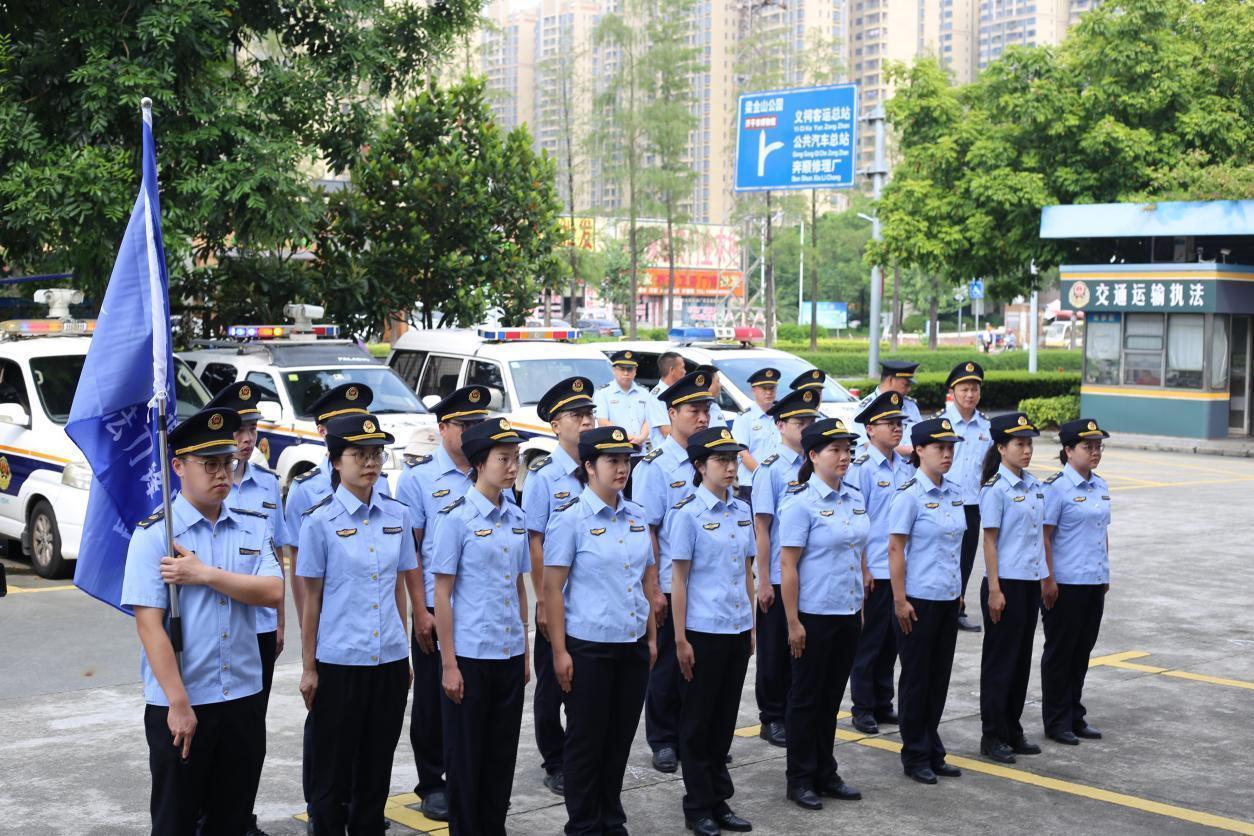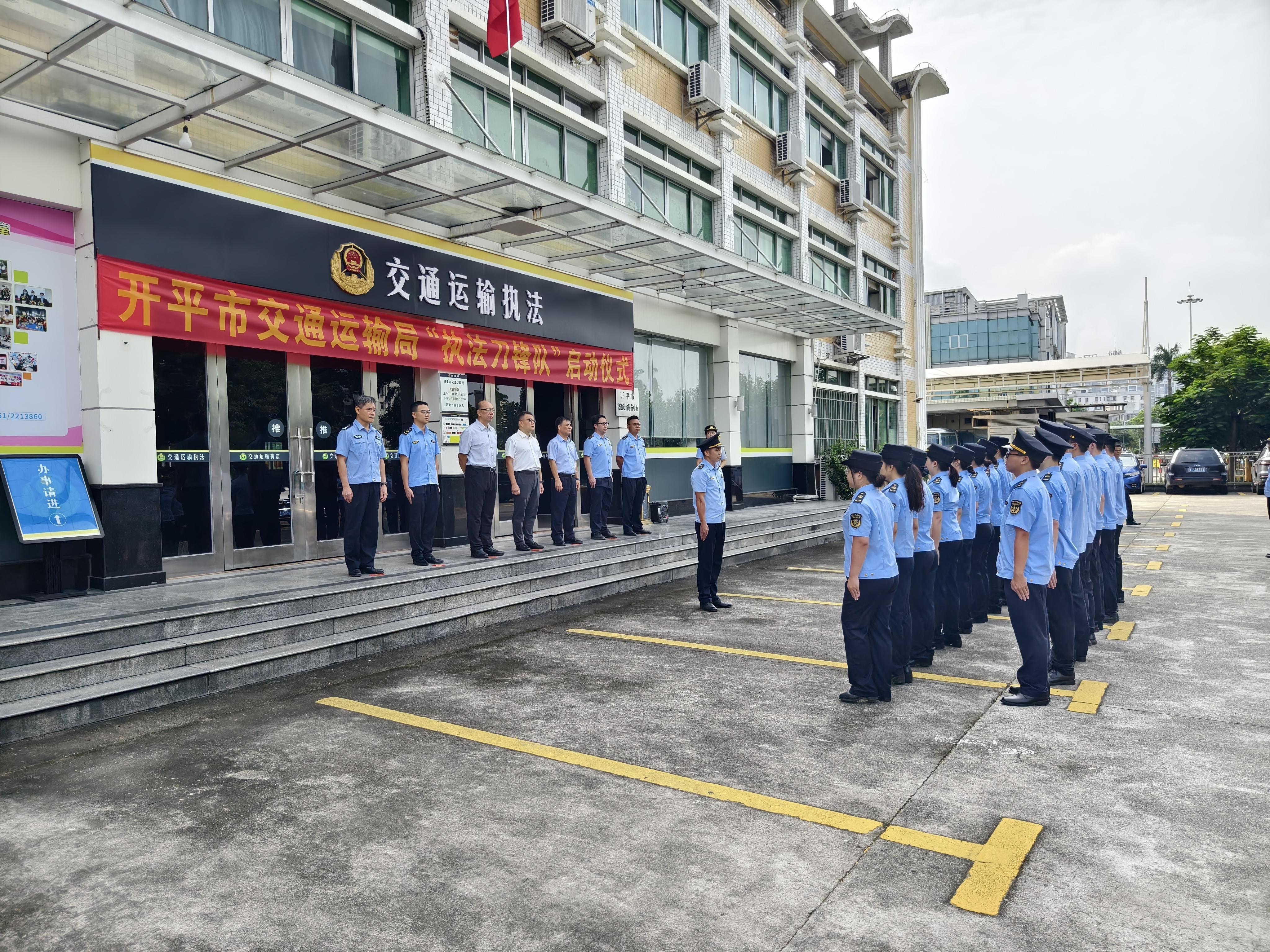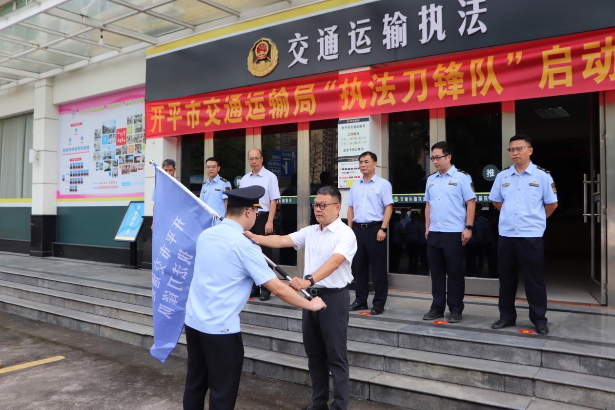 仪式上,江门市交通运输局党组成员、副局长黄振中宣布海棠直播 交通运输局执法刀锋队正式成立,并为执法刀锋队授旗,参会领导共同按响汽笛。伴随着“交通铁军勇担当,刀锋执法创新篇”嘹亮口号,海棠直播 交通运输局执法刀锋队全面展开执法行动。