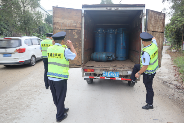 当晚,市交通运输局收到预警信息提示,有一辆疑似装载大量液化石油气瓶的重型厢式货车准备进入我市高速收费站。我局迅速启动联合行动机制,派出交通运输执法人员于11月2日凌晨3时前往我市百合高速收费站进行布控工作。两小时后,可疑车辆经过高速收费站,我局执法人员立即联合市公安局、市城市管理和综合执法局对其进行跟踪拦截,并成功在国道G325赤坎路段查获粤J牌车辆。经查,该车辆装载着343瓶实瓶的瓶装液化石油气,其中5kg规格的1瓶,50kg规格的2瓶,15kg规格的340瓶。