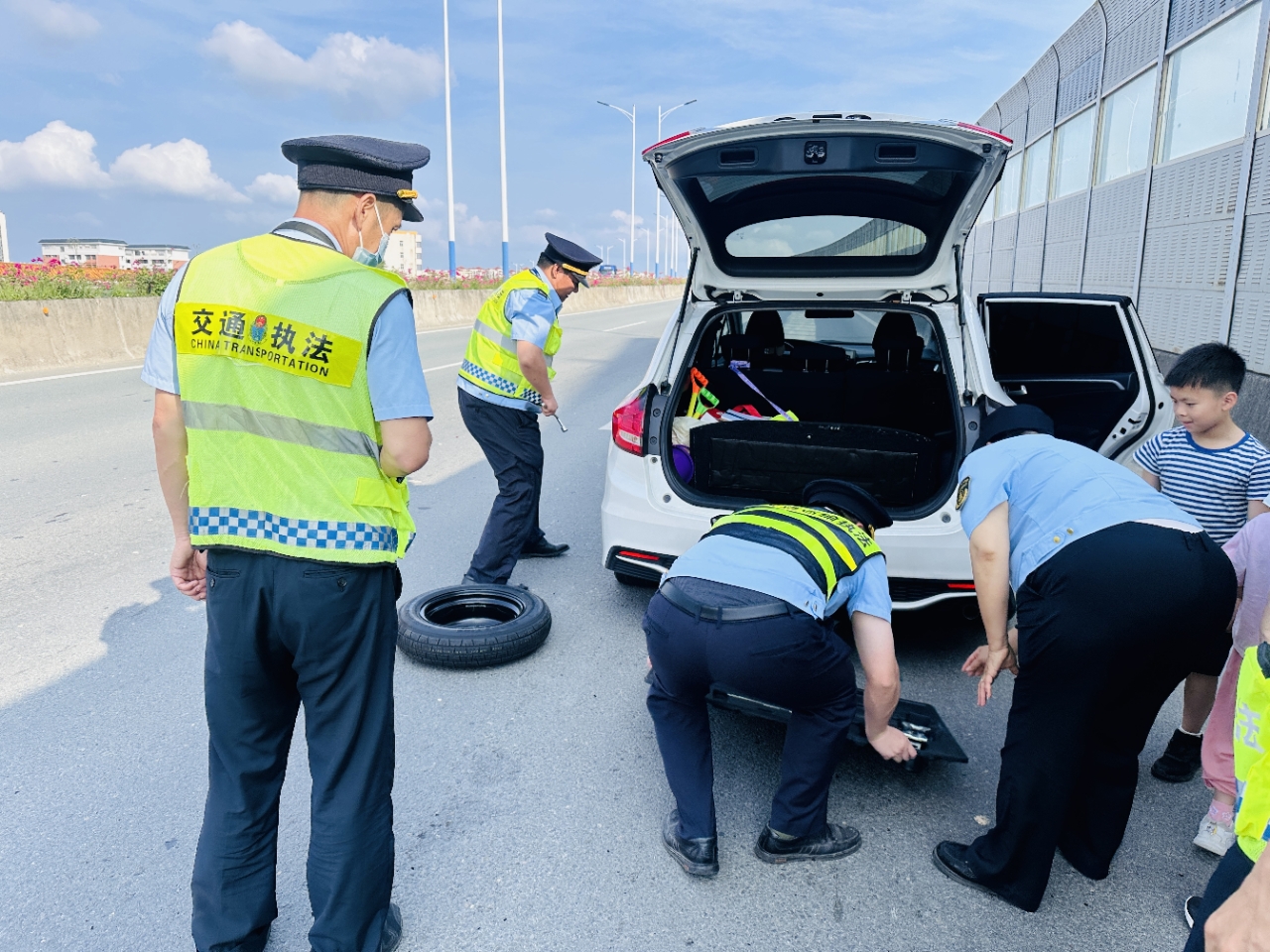 高效处置险情,消除道路风险。5月4日下午,交通运输执法人员在环城公路西环段高架桥巡查时,发现一辆小轿车因左后轮爆胎停靠在右侧路面,车主未按规定摆放三角警示牌,存在严重安全隐患。执法人员迅速设置警示标志,协助更换备用轮胎,并护送车辆至合规汽修厂检修,及时消除道路通行风险。