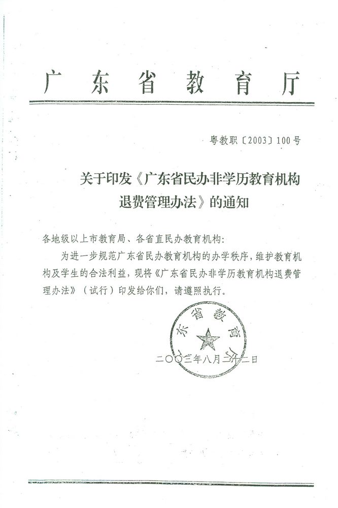 关于印发《广东省民办非学历教育机构退费管理办法》的通知