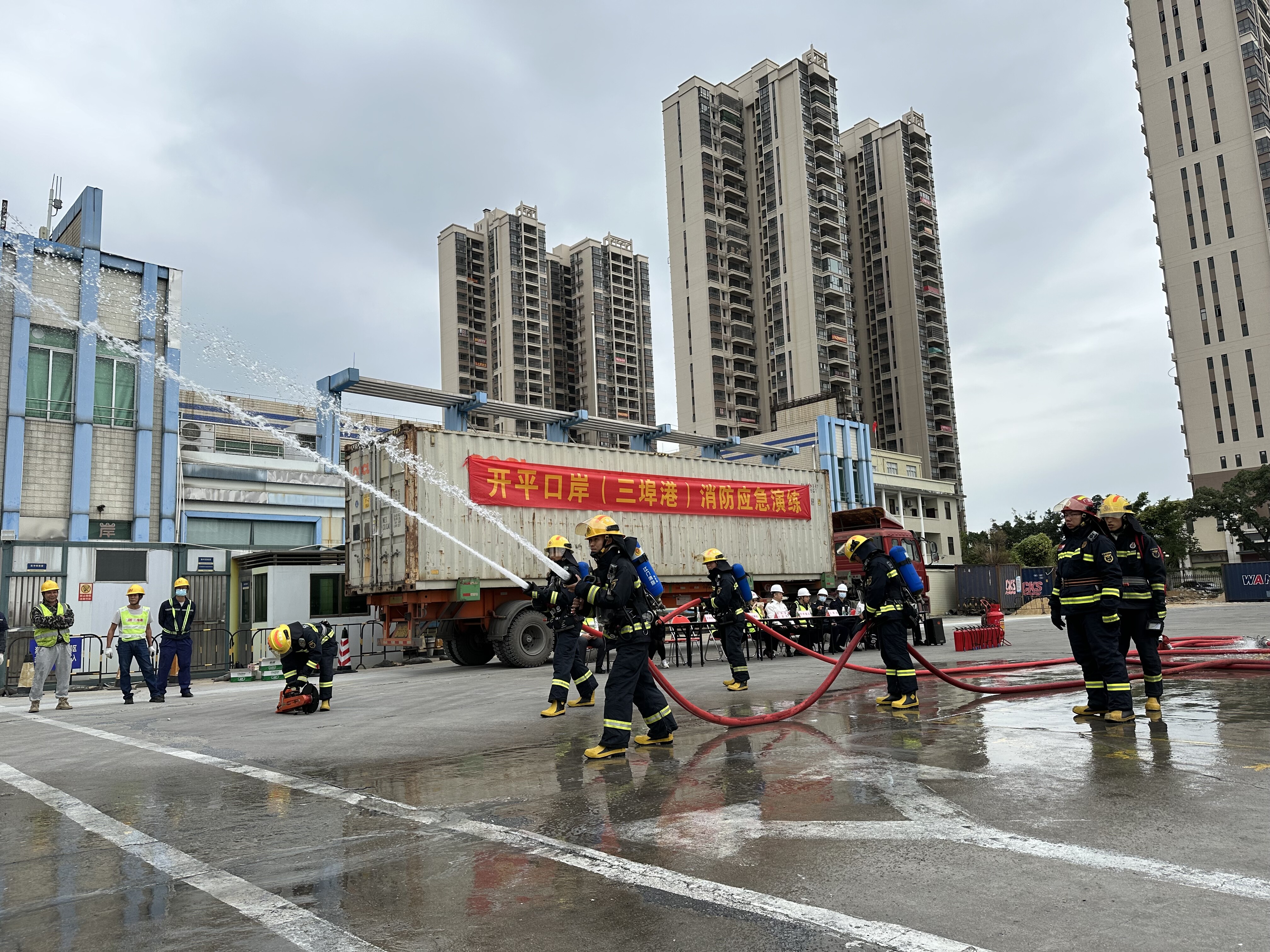 本次演练模拟码头集装箱堆垛突然冒烟起火,港区立即启动火灾事故应急响应,根据火势级别执行具体的灭火方案和疏散方案,包括港区开展自救和消防部门到场后灭火和救援各项工作,以及火灾警报解除后恢复工作,是一次应急响应全流程模拟演练。模拟演练结束后,港区员工还在市消防大队消防员的指导下,对使用消防带、码头前沿消防管、灭火筒等消防设备进行了实操练习。