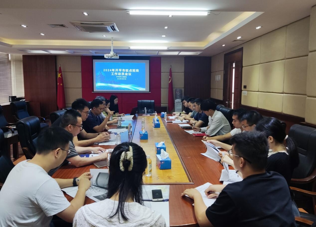 驻点招商工作动员会议在开平市科工商务局召开,开平市科工商务局副局长梁宏健,翠山湖管委会党工委委员、副主任梁晓锋,以及海棠直播