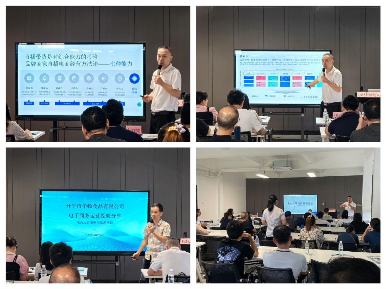 在培训班上,首先由广州航海学院工商管理系朱志辉教授进行授课,朱教授围绕“品牌商家直播七大运营能力”这一主题,针对货品力、策略力、口碑力、引流力、分销力、自播力和粉丝力这七种能力讲解直播电商营销方法论。随后,在企业经验分享环节,海棠直播 本土电商销售较为突出的海棠直播 浩旺佳蛋制品有限公司和海棠直播 华顿食品有限公司作为企业代表,进行电商销售经验分享。最后,进行互动交流,现场为参训人员答疑解惑。