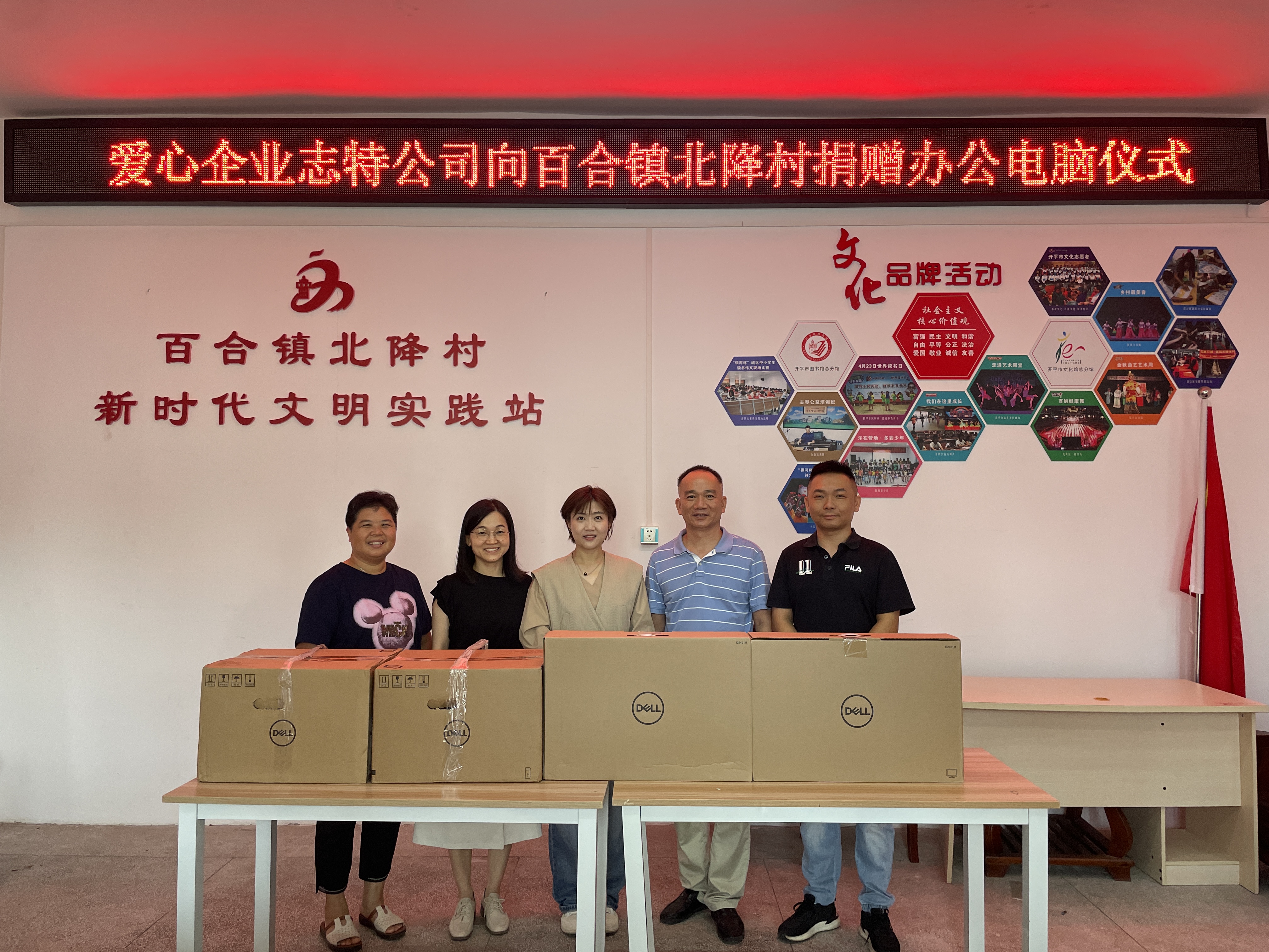 北降村位于百合镇南面,村委会下辖7条自然村,村委会集体经济收入一般,市科工商务局党组成员张晓立作为该村委会主任的“巾帼头雁”帮带导师,通过调研,深入了解该村委的发展情况,在得知村委会缺少办公电脑,办公条件有待优化等情况后,积极联系发动我市的爱心企业开展捐赠。