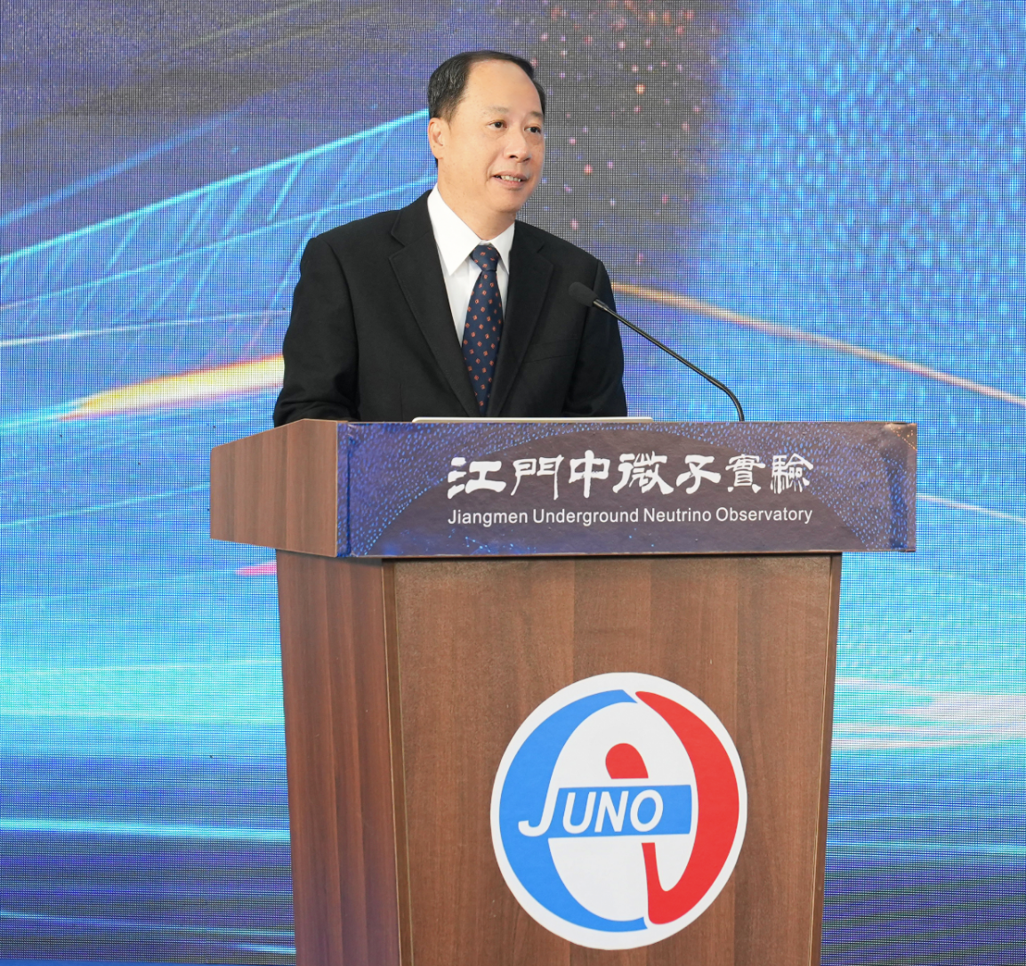 11月19日上午,江门中微子实验装置建设成功暨首个物理成果发布会在江门举行。这是我国基础科学研究领域的重大里程碑,是粤港澳大湾区国际科技创新中心建设的标志性成果。中国科学院副院长、党组成员丁赤飚,江门市委书记陈岸明,意大利驻华大使馆公使Cristina Carenza参加发布会并致辞。中国科学院院士张焕乔、陈和生,中国科学院高能物理研究所党委书记王生,省科技厅副厅长吴世文参加发布会。中国科学院院士王贻芳在会上介绍江门中微子实验室的基本情况,中国科学院高能物理研究所所长曹俊主持发布会。