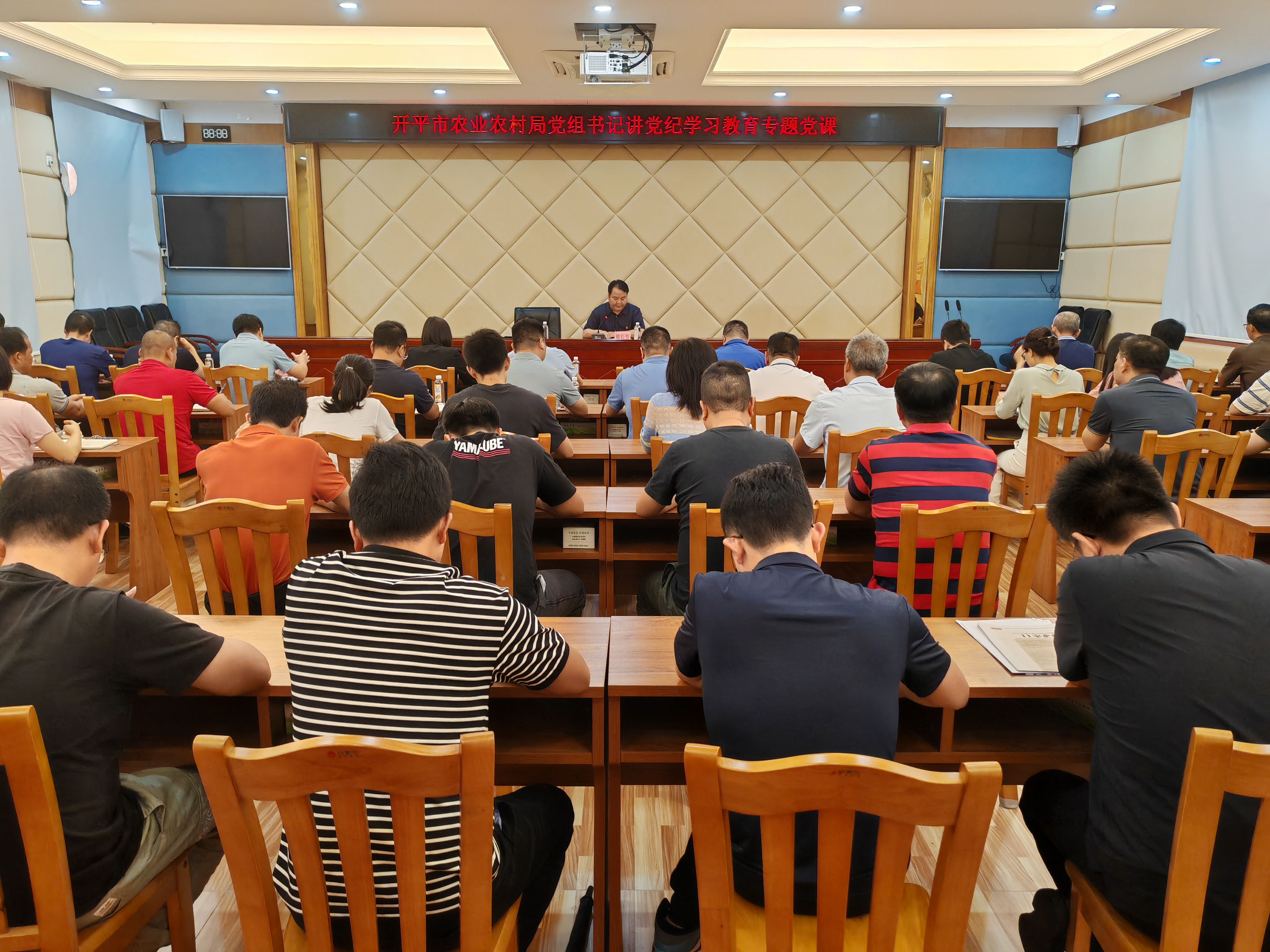 农业农村局召开主题党日+党纪学习教育,活动由局机关党支部书记杨国威主持,局系统全体在职党员参加。 会上,杨国威同志首先带领全体党员逐条学习《条例》第六章第七章关于对违反政治纪律和组织纪律行为的处分内容。 随后,局党组书记、局长郁长青同志给全体党员讲题为《坚持问题导向,推进全面从严治党向纵深延伸——新修订的<中国共产党纪律处分条例>》的党纪学习教育专题党课,深入解读了《条例》修订的重点和意义,为全体党员准确把握、深刻理解《条例》的主旨要义和规定要求提供了有益指导。 最后,全体党员观看廉政教育片《零容忍》第5集《永远在路上》。通过观看教育片,进一步教育引导全体党员干部进一步增强严守政治纪律和政治规矩的思想自觉和行动自觉,加强党性修养,坚定理想信念,守住纪律、规矩、道德底线,始终做政治上的明白人,做遵章守纪的老实人。