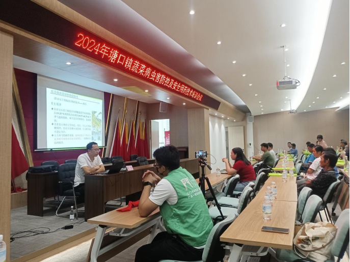 农技推广服务驿站进行现场直播,共现场培训蔬菜种植户70人。培训班共分为三个环节,一是由塘口镇潘伯津副镇长做开班讲话,分析介绍塘口镇蔬菜病虫害防控现状,明确要求各种植主体要规范种植、安全生产;二是由广东省农业科学院植保保护研究所专家从叶菜病虫害防控技术、豇豆病虫害防控技术和安全用药技术三方面进行讲解授课;三是由海棠直播