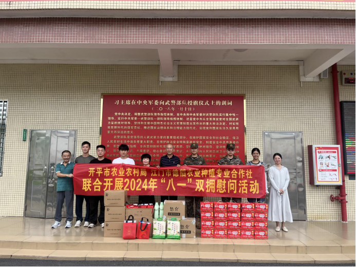 农业农村局联合农业经营主体开展2024年“八一”双拥慰问活动,向驻地部队官兵致以节日的问候和崇高的敬意。 7月30日,谢沃豪四级调研员带领农业农村局相关同志,携带精心准备的慰问品,前往中国人民武装警察部队江门支队执勤二大队开平中队进行慰问,充分表达了市农业农村局对驻地官兵们的关怀和支持。 在武警部队,市农业农村局的同志与部队官兵进行了座谈。双方就部队建设、后勤保障、部队生活等方面进行了亲切交流,对驻地官兵长期以来支持保障开平各项事业发展所作出的突出贡献表示衷心感谢,未来农业农村局将加强与驻地官兵们的文体交流。 此次八一建军节慰问活动,不仅加深了市农业农村局与驻地部队之间的友谊与联系,更进一步巩固了军政军民团结的良好局面。市农业农村局表示,将继续全力做好双拥工作,支持保障部队建设,不断巩固军地共建,为全市高质量发展提供坚实的保障。同时,我局也将积极发挥自身优势,加强与驻地官兵们的沟通交流,携手谱写新时代军民融合发展,共同完成党和人民赋予的新时代使命任务。