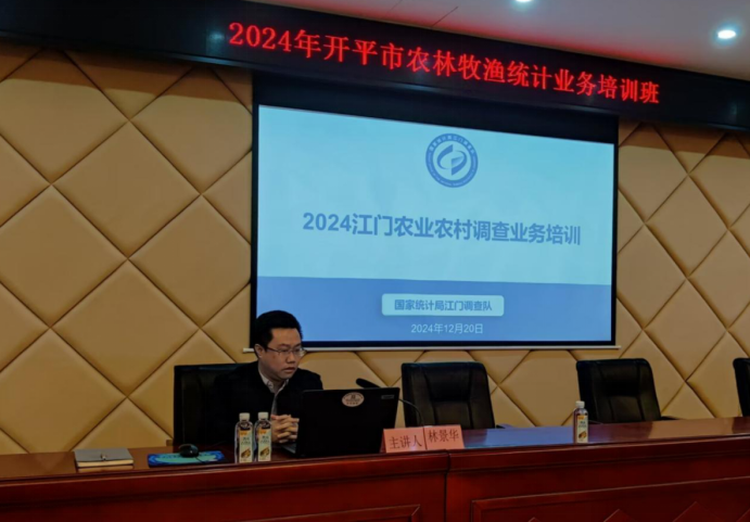 农林牧渔统计业务培训班。会议共有三项议程,一是由国家统计局江门调查队进行粮食、畜牧业统计调查业务培训;二是由市统计局对农业统计相关业务进行培训;三是由市统计局和市农业农村局进行领导总结讲话。市农业农村局系统、市统计局、市林业局和各镇(街)代表共约45人参加了会议。 会议首先由国家统计局江门调查队农业农村调查科科长林景华从四个方面对2024江门农业农村调查业务进行培训。一是讲解粮食统计调查,强调要关注粮食小品种单产异常高的问题。二是讲解畜牧业统计调查,提醒统计表中特别种类畜禽的统计方式。三是进行指标解释及基本知识介绍,关注符合行业运行规律的参数。四是学习农业农村统计调查基层基础,包括工作制度和业务运行规范。 会议第二个议程由市统计局业务专员对农业统计相关业务进行培训。侧重介绍报表制度修订情况,梳理了综合年报表式和基层年报表式变化的内容。强调镇级各台账报送时间要符合农作物生长规律,加强对镇级各台账报送的审核和监管。同时,逐一讲解了种植业和畜牧业相关数据报送的要点。 会议最后由市统计局党组书记、局长李健鹏和市农业农村局党组书记、局长郁长青分别作总结发言。李健鹏指出,一是要高度重视农业统计工作。各镇(街)要充分认识农业统计工作的重要性和紧迫性,增强责任感与使命感;二是要夯实农业基层基础工作。要重视镇街和村农业综合统计台账的建立和归档管理,在加强对各镇(街)报送台账指导的同时,也要注重对台账报送质量的审核,着力提升农业基层台账建设质量,真实反映我市农业农村经济社会发展成果。郁长青指出,农业经济数据是国民经济数据的重要组成部分,做好农业经济统计对农业可持续发展提供数据支撑。一是要提高政治站位,重视农业统计工作,做到应统尽统。二是要配合统计局加强对农业监测点的监管,保障农产品质量安全。三是挖掘农业新增长点,引进具有创新性和竞争力的农业企业和项目,提升本地农业产业的整体水平。