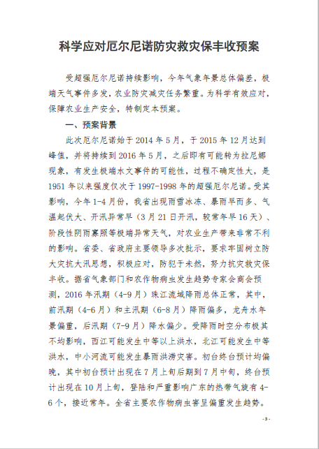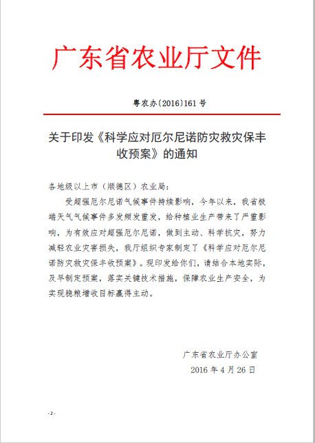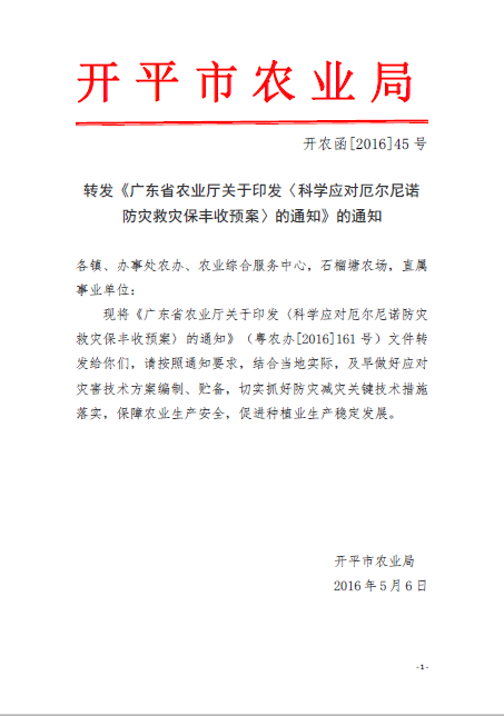 转发《广东省农业厅关于印发〈科学应对厄尔尼诺防灾救灾保丰收预案〉的通知》的通知(开农函[2016]45号)