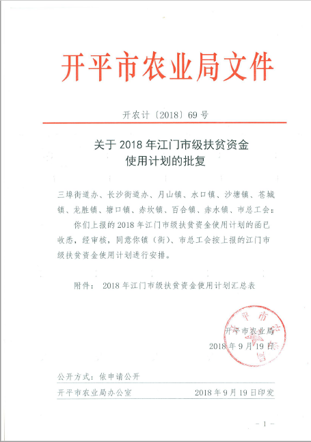 开农计[2018]69号关于2018年江门市级扶贫资金使用计划的批复