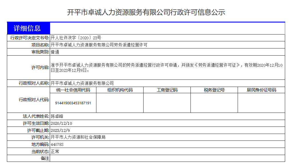 海棠直播 卓诚人力资源服务有限公司行政许可信息公示