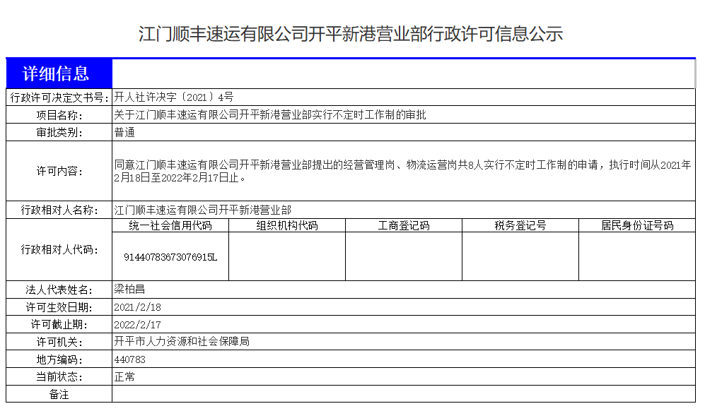 江门顺丰速运有限公司开平新港营业部行政许可信息公示
