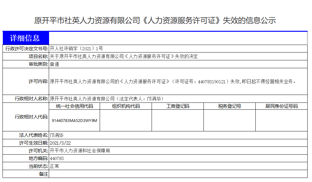 原海棠直播 社英人力资源有限公司《人力资源服务许可证》失效的信息公示