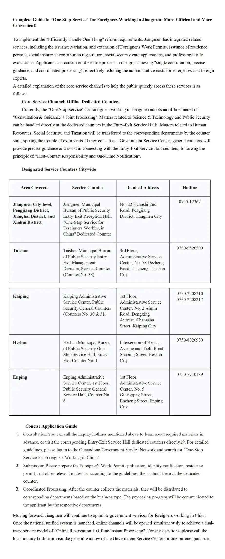 接下来,江门市将持续优化外国人来华工作的政务服务,待国家统建系统上线后,将同步开通线上办理渠道,实现“线上预约+线下即办”的双轨服务模式。如有疑问,可拨打对应区域咨询电话,或前往政务服务大厅综合窗口获取一对一指引。