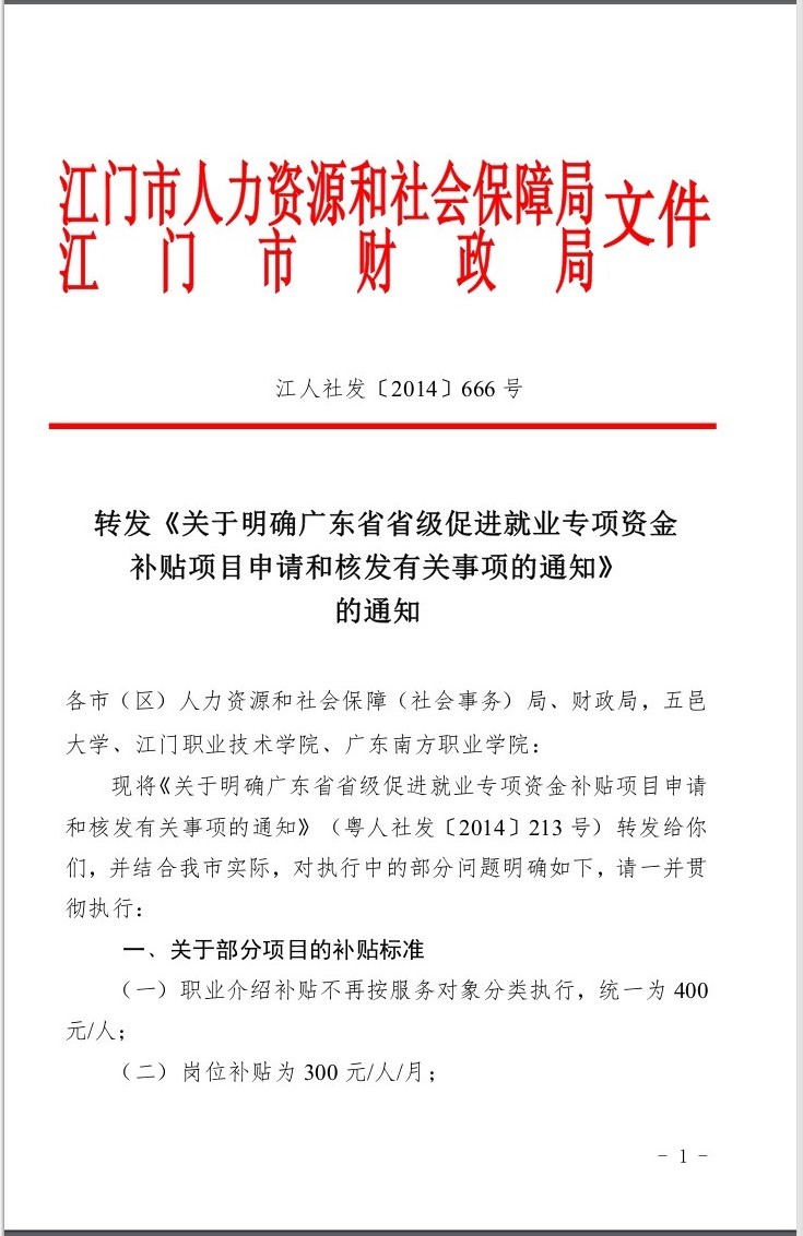 关于明确广东省省级促进就业专项资金补贴项目申请和核发有关事项的通知