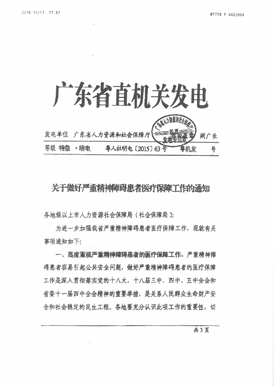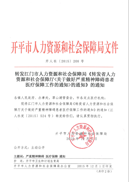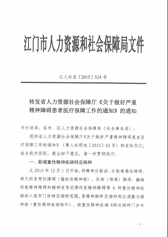 转发江门市人力资源和社会保障局《转发省人力资源和社会保障厅《关于做好严重精神障碍患者医疗保障工作的通知》的通知》的通知