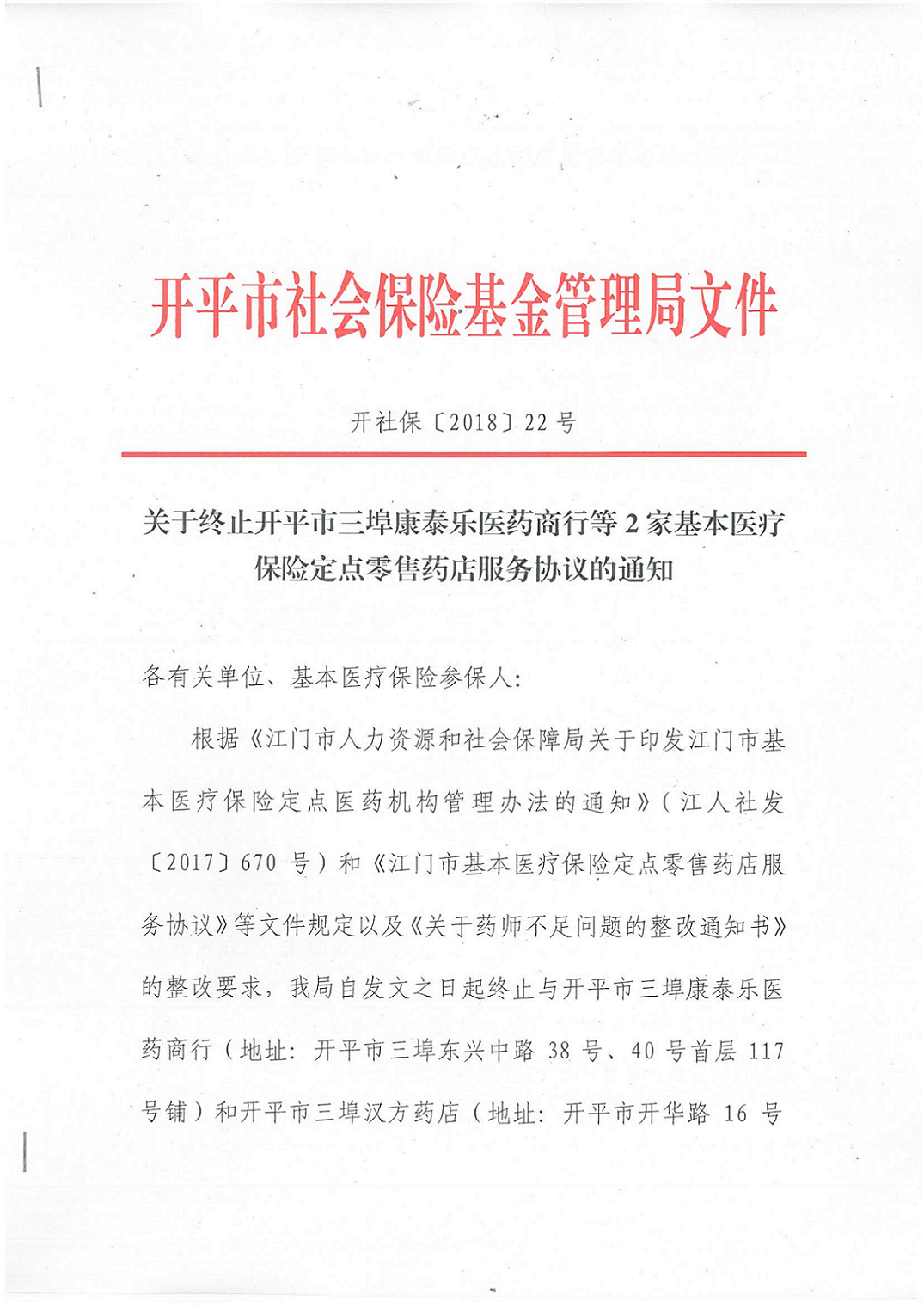 关于终止海棠直播 三埠康泰乐医药商行等2家基本医疗保险定点零售药店服务协议的通知