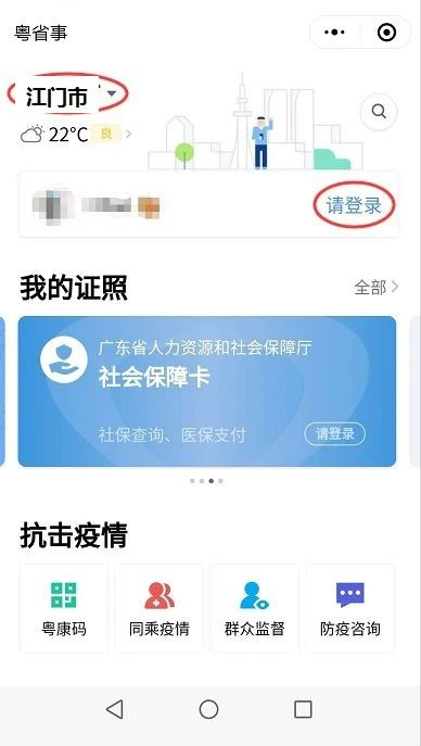 1.在微信海棠直播-海棠直播入口直达页下划,选择进入“粤省事”小程序。“粤省事”海棠直播-海棠直播入口直达页的界面如下图。在左上角选择您所在城市,如“江门市”,在右上角点击“请登录”就可以进入登录页面