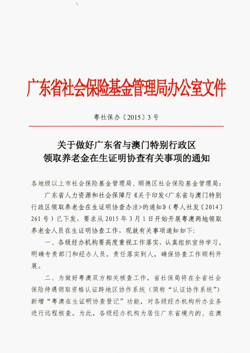 关于做好广东省与澳门特别行政区领取养老金在生证明协查有关事项的通知