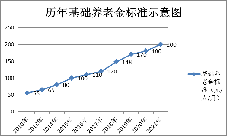 基础养老金自2021年9月1日起调整为每人每月200元。