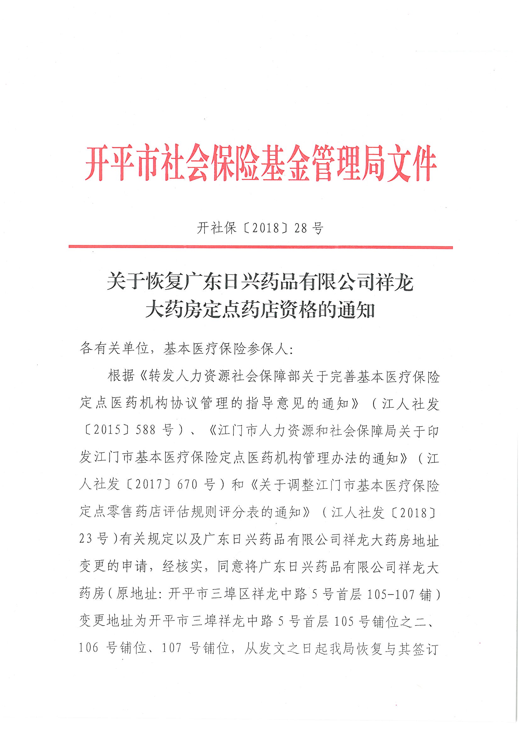 关于恢复广东日兴药品有限公司祥龙大药房定点药店资格的通知