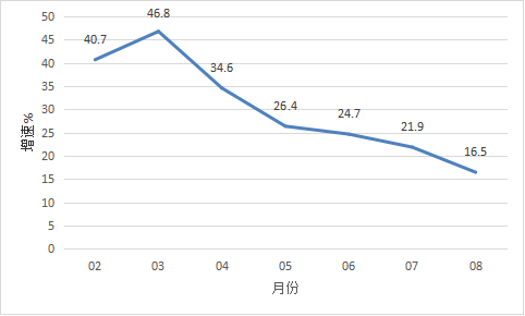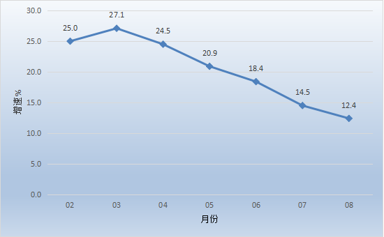 1-8月经济运行简况 1-8月,全市主要经济指标运行简况如下: 一、工业生产 1-8月,开平规模以上工业企业累计完成工业增加值76.06亿元,同比增长16.5%。 分经济类型看,股份制企业增长27.4%;外商及港澳台商投资企业增长9.6%;私营企业增长27.8%。分门类看,采矿业增加值增长1.6%,制造业增加值增长16.6%,电力、热力、燃气及水生产和供应业增加值增长18.1%。 1-8月全市工业用电量增长24.1%。 图一:2021年2月以来我市工业增加值增速情况 二、投资 1-8月,全市完成固定资产投资同比增长12.3%。分经济类型看,国有投资增长19.0%;民间投资增长30.2%。分产业看,第一产业投资增长161.3%;第二产业投资增长27.8%,其中工业投资增长27.8%;第三产业投资增长2.2%,其中房地产投资下降22.0%。 三、消费市场 1-8月,我市完成社会消费品零售总额114.74亿元,同比增长12.4%。 图二:2021年2月以来我市社会消费品零售总额增速情况 四、财政收入 1-8月,全市实现地方一般公共预算收入21.17亿元,同比增长17.3%,其中税收收入11.71亿元,同比增长15.0%。 五、金融市场 1-8月,全市金融机构本外币各项存款余额748.51亿元,同比增长6.0%;本外币各项贷款余额517.58亿元,同比增长12.8%。全市金融机构人民币各项存款余额730.34亿元,同比增长6.4%;人民币各项贷款余额515.99亿元,同比增长12.6%。 2021.09.26