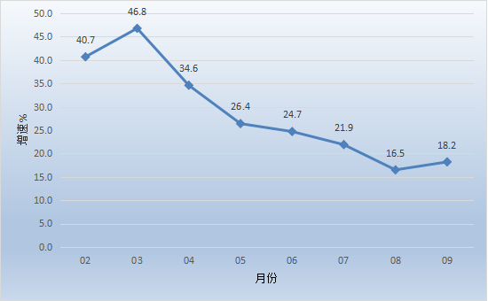 1-9月经济运行简况 1-9月,全市主要经济指标运行简况如下: 一、工业生产 1-9月,开平规模以上工业企业累计完成工业增加值89.32亿元,同比增长18.2%。 分经济类型看,股份制企业增长34.7%;外商及港澳台商投资企业增长7.6%;私营企业增长25.8%。分门类看,采矿业增加值增长3.1%,制造业增加值增长18.3%,电力、热力、燃气及水生产和供应业增加值增长16.7%。 1-9月全市工业用电量增长21.0%。 图一:2021年2月以来我市工业增加值增速情况 二、投资 1-9月,全市完成固定资产投资同比增长17.9%。分经济类型看,国有投资增长40.8%;民间投资增长38.4%。分产业看,第一产业投资增长146.1%;第二产业投资增长46.5%,其中工业投资增长46.5%;第三产业投资增长2.9%,其中房地产投资下降21.7%。 三、消费市场 1-9月,我市完成社会消费品零售总额133.83亿元,同比增长12.1%。 图二:2021年2月以来我市社会消费品零售总额增速情况 四、财政收入 1-9月,全市实现地方一般公共预算收入24.34亿元,同比增长14.7%,其中税收收入13.07亿元,同比增长17.2%。 五、金融市场 1-9月,全市金融机构本外币各项存款余额755.99亿元,同比增长5.2%;本外币各项贷款余额523.10亿元,同比增长11.9%。全市金融机构人民币各项存款余额738.32亿元,同比增长5.4%;人民币各项贷款余额522.18亿元,同比增长11.8%。