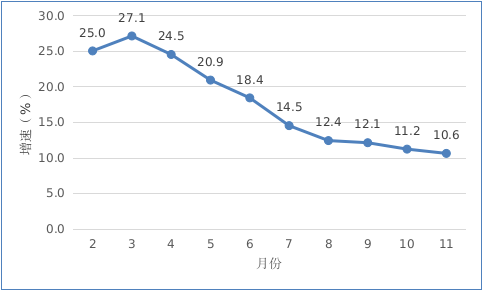 1-11月经济运行简况 1-11月,全市主要经济指标运行简况如下: 一、工业生产 1-11月,开平规模以上工业企业累计完成工业增加值110.15亿元,同比增长16.1%。 分经济类型看,股份制企业增长30.0%;外商及港澳台商投资企业增长6.8%;私营企业增长20.6%。分门类看,采矿业增加值增长6.5%,制造业增加值增长16.2 %,电力、热力、燃气及水生产和供应业增加值增长15.6%。 1-11月全市工业用电量增长17.4%。 图一:2021年2月以来我市工业增加值增速情况 二、投资 1-11月,全市完成固定资产投资同比增长10.2%。分经济类型看,国有投资增长5.6%;民间投资增长28.8%。分产业看,第一产业投资增长89.0%;第二产业投资增长28.4%,其中工业投资增长28.4%;第三产业投资下降0.2%,其中房地产投资下降19.1%。 三、消费市场 1-11月,我市完成社会消费品零售总额165.17亿元,同比增长10.6%。 图二:2021年2月以来我市社会消费品零售总额增速情况 四、财政收入 1-11月,全市实现地方一般公共预算收入28.75亿元,同比增长13.0%,其中税收收入16.40亿元,同比增长11.9%。 五、金融市场 1-11月,全市金融机构本外币各项存款余额744.17亿元,同比增长5.1%;本外币各项贷款余额490.55亿元,同比增长3.2%。全市金融机构人民币各项存款余额726.37亿元,同比增长5.2%;人民币各项贷款余额489.54亿元,同比增长3.1%。 2021.12.26