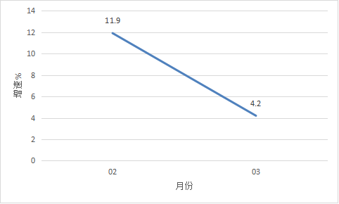 2022年2月以来我市规模以上工业增加值情况 三、投资 一季度,全市完成固定资产投资同比增长25.6%。从分经济类型看,国有投资增长126.6%;民间投资增长25.7%。分产业看,第一产业投资增长52.0%;第二产业投资增长13.9%,其中工业投资增长13.9%;第三产业投资增长34.6%,其中房地产投资增长6.3%。 四、消费市场 一季度,我市完成社会消费品零售总额42.49亿元,同比增长3.5%。 图二