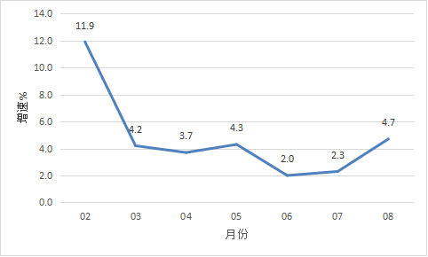 2022年2月以来我市规模以上工业增加值情况 二、投资 1-8月,全市完成固定资产投资同比下降14.7%。从分经济类型看,国有投资增长33.1%;民间投资下降11.5%。分产业看,第一产业投资下降48.2%;第二产业投资增长下降0.5%,其中工业投资下降0.5%;第三产业投资下降22.3%,其中房地产投资下降31.7%。 三、消费市场 1-8月,我市完成社会消费品零售总额118.17亿元,同比增长3.0%。 图二