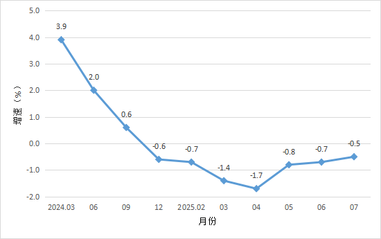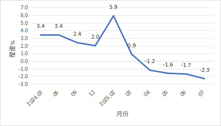 规模以上工业增加值增速 二、投资 1-7月,全市固定资产完成投资同比下降26.6%。分经济类型看,国有投资下降8.7%;港澳台和外商投资增长13.8%;民间投资下降25.8%。 三、消费市场 1-7月,我市完成社会消费品零售总额97.25亿元,同比下降0.5%。 图2
