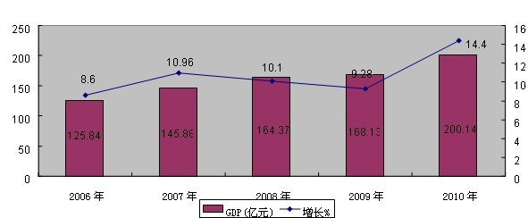 2010年,全市国民经济继续保持健康发展,经济增长速度适度加快,经济运行质量明显提高。初步核算全年实现生产总值200.14亿元(当年价),比上年增长14.4%。其中:第一产业增加值20.09亿元,增长4.2%;第二产业增加值103.66亿元,增长20.5 %;第三产业增加值76.39亿元,增长9.0%。第一、二、三产业增加值的比重为10.0 : 51.8 : 38.2。按户籍人口计人均生产总值29105元。