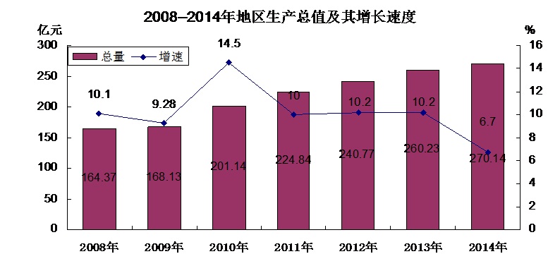 标兵文明单位495个。 注:1、本公报中2014年数据为初步统计数,统计图中2008--2013年数据为年报数。 2、公报中的地区生产总值、各产业增加值绝对数按现行价格计算,增长速度按可比价格计算。 3.国家统计局实施了城乡一体化住户调查改革,2014年按照新的调查口径对外发布城镇和农村常住居民人均可支配收入数据。由于新老调查方案在调查范围、调查对象、城乡划分标准、样本抽选、计算和汇总方式、指标口径等方面变化较大,改革后新口径和旧口径数据存在不可比的差异。