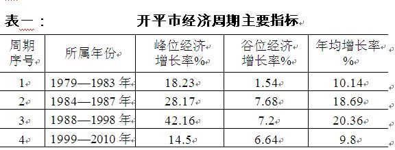 第四个周期(1999—2010年):用时12年,比江门市短3年,比广东省长2年。地区生产总值年均增长9.8%。这一周期的谷位出现在2005年,谷位过后经过5年时间的波动发展才出现峰位完成这一经济周期。波动幅度为7.86个百分点,是改革开放以来波动幅度最小的一个周期,但也同样比江门市波幅大0.76个百分点,比省的波幅大2.76个百分点。
