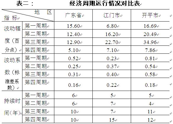 我市经济周期呈现前快后稳的总体特征。我市经济在改革开放初期发展较快,在第一周期快起快落,波动系数达0.812,在第二周期后表现更为快速,历时4年完成峰谷位交替,但波动系数下降到0.54;第三周期则受邓小平同志南巡以及撤县设市带动一大批重点项目投入上马等促进,波动系数比第二周期上升0.044,达0.584;在第四周期的发展,则有所放缓但表现平稳,波动系数下降到0.179。具体见表一和表二:
