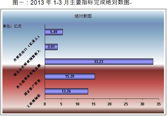 第一季度,工业增加值13.26亿元,比去年同期增长0.4%;固定资产完成投资额15.39亿元,比去年同期增长21.36 %;社会消费品零售总额达33.23亿元,比去年同期增长12.96%,;地方公共财政预算收入3.91亿元,比去年同期增长13.45%,增速比去年同期高出2.51个百分点;外贸进出口总额5.49亿美元,比去年同期增长0.27 %。