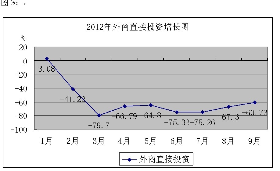 受当前经济形势的影响,我市经济在经历前段时间的波动后,在第三季度的各项指标有升有降,有向上发展呈回稳态势的,也有发展末如理想的。具体情况如下: 外商直接投资方面。1—9月份,我市实际利用外商直接投资4703万美元,只完成年度任务39.82%,同比下降60.73%,已连续8个月在负增长里徘徊。见图3: (三)园区经济进入发展期
