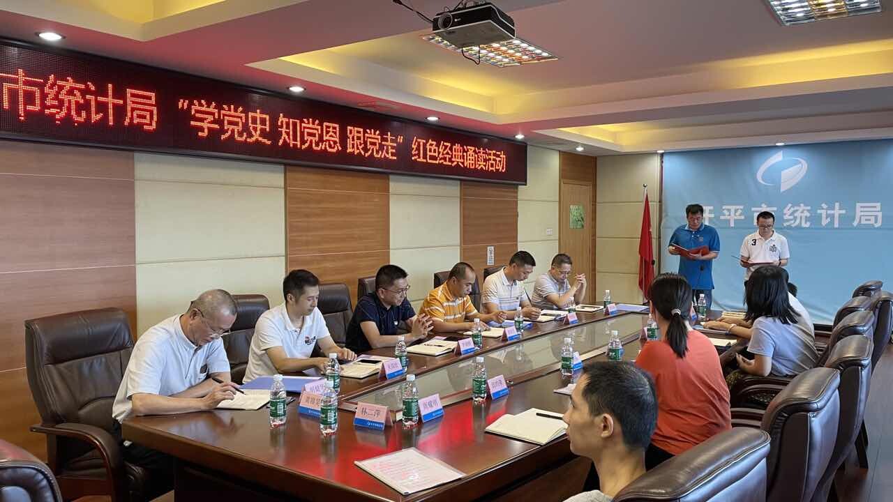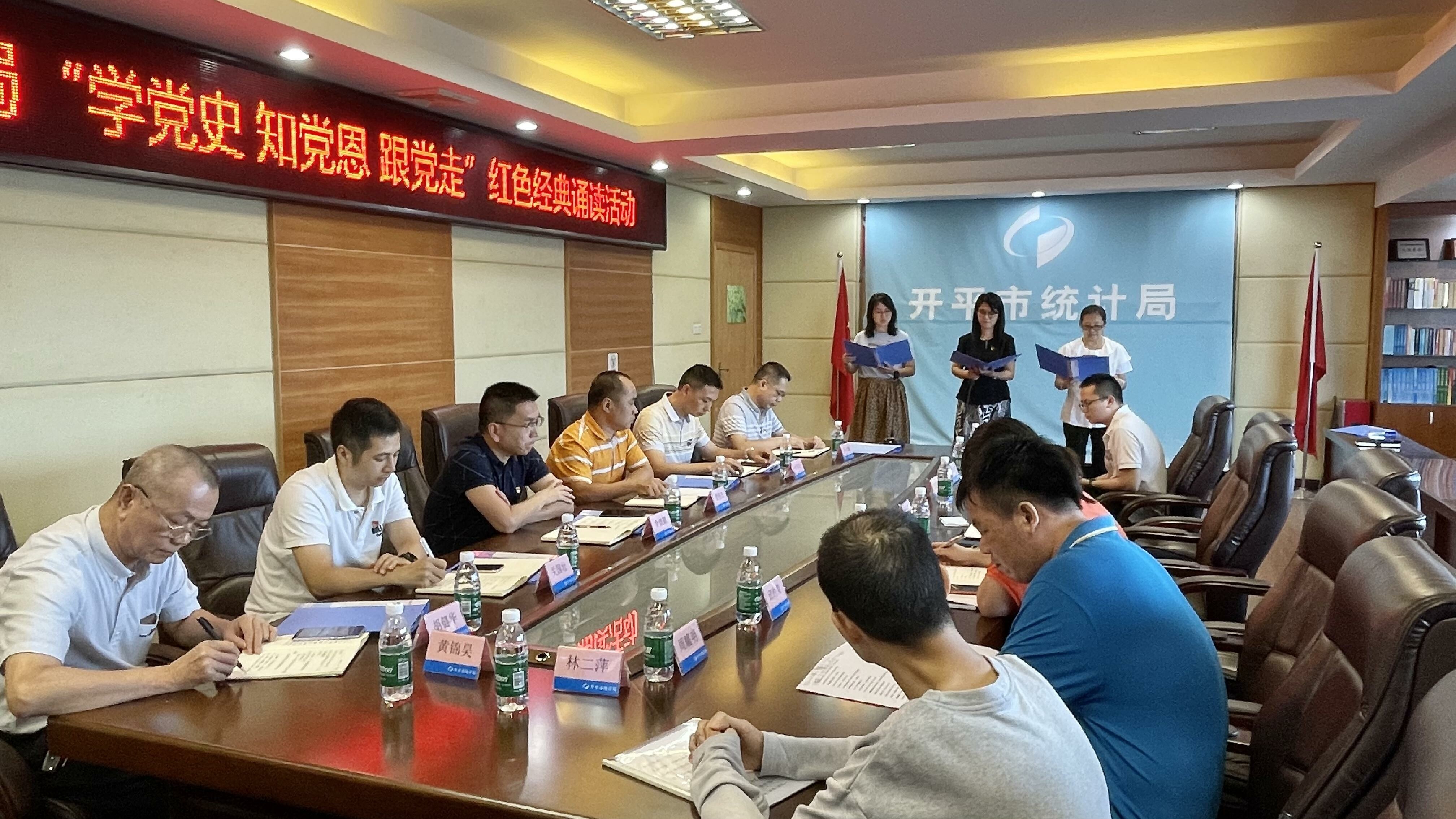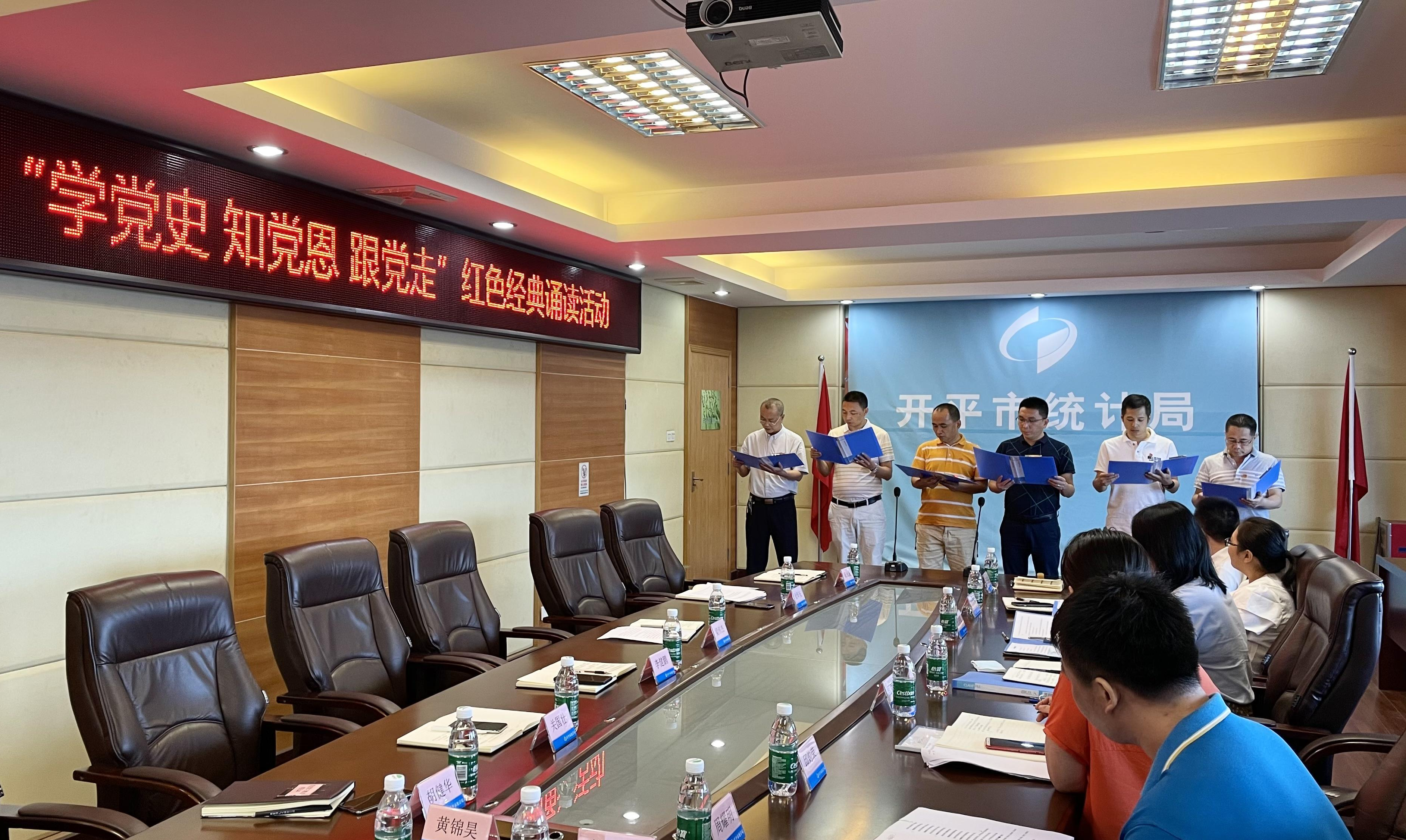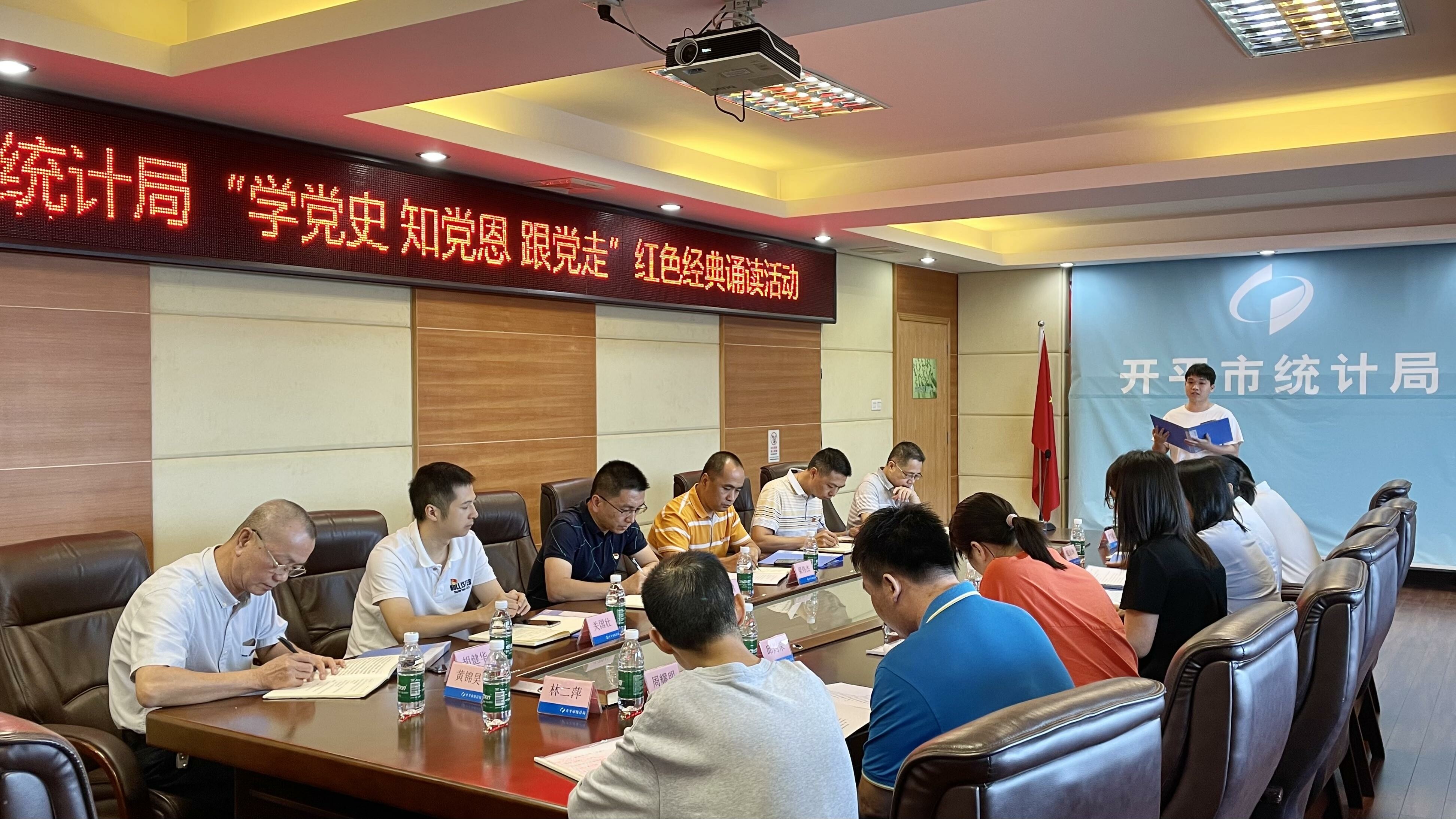 知党恩 跟党走 红色经典诵读”主题党日活动。 活动以“朗读者”的形式开展。局科级以上党员领导干部以一首铿锵有力的《我骄傲,我是中国人》集体诵读拉开了活动的帷幕。随后,党员同志、入党积极分子分别朗诵了《红船,从南湖起航》、《党的历史永远辉煌》、《我爱这土地》、《我的祖国》等红色经典作品。一篇篇经典的文章,展现出建党百年的光辉成就;一段段激情澎湃的朗诵,充分表达了大家对党、对祖国的无限热爱,更彰显了统计人“永远跟党走”的坚定信心。 本次红色经典诵读活动引起了局全体党员干部强烈的情感共鸣。大家表示备受感动与鼓舞,不仅增强了民族自信心和自豪感,也强化了作为党员干部的责任感和使命感,在今后的工作中,将继续守初心、跟党走,始终坚持以习近平新时代中国特色社会主义思想为统领,加强党史学习教育,进一步增强党性修养,充分发挥党员干部的发挥先锋模范带头作用,为统计事业发展奉献自己的智慧和力量。市统计局党支部开展“学党史 知党恩 跟党走 红色经典诵读”主题党日活动