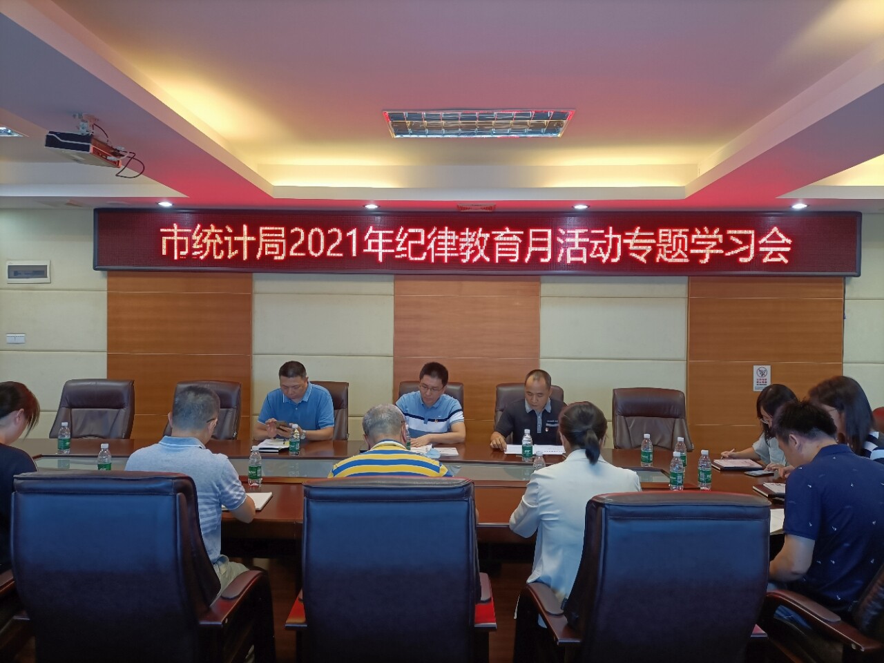 委办公室关于印发〈2021年全市开展纪律教育学习月活动的实施意见〉的通知》精神,对市统计局开展纪律教育学习月活动作进一步部署。 会议指出,全体党员干部要严格按照局2021年纪律教育学习月活动实施方案要求,紧紧围绕“学党史悟思想,守纪律铸忠诚”主题,认真开展好“七个一”规定动作和“一个一”自选动作,即举办一系列纪律教育学习会、讲好一堂警示教育专题课、用好一批本土教育基地、开展一场廉政谈心谈话、观看一部警示教育片、学习一套警示教育读本、解决一些群众急难愁盼问题、开展一次统计职业道德教育活动。 会议强调,全体干部职工要切实统一思想,充分认识开展纪律教育学习月活动的重要意义,加强组织领导,将教育学习安排有机融入党史学习教育之中,深入学习贯彻习近平新时代中国特色社会主义思想,用党的奋斗历程和伟大成就增强信心、鼓舞斗志,用党的光荣传统和优良作风坚定信念、凝聚力量,增强“四个意识”、坚定“四个自信”、做到“两个维护”,强化党章党规党纪意识,锤炼忠诚干净担当政治品格,在党史学习和纪律教育活动中涵养正气、汲取清廉力量,将学习成果转化为推动统计事业高质量发展的实际行动。 会上,李健鹏同志围绕学习教育主题,从“统计违纪违法案例警示、用身边事教育身边人、深入学习领会习近平总书记重要论述、深入整治群众身边腐败和作风问题、工作要求”五个方面讲授警示教育专题课,要求大家旗帜鲜明讲政治,不断提高政治“三力”,做“对党忠诚、严守纪律、敢于担当”的统计人。 会议要求,全体党员干部开展纪律教育学习月活动要做到“三结合”:与做好巡视巡察工作结合起来,与“为群众办实事”实践活动结合起来,与本职岗位职责结合起来,认真进行自查自纠,推动活动取得实实在在的成效。 会议还组织集中学习警示教育读本《近鉴》等,以案示警、以案明纪,引导全体党员干部进一步知敬畏、存戒惧、守底线。