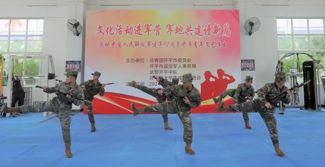 文艺演出在开平青年精彩纷呈的武术表演中拉开帷幕,长笛《美丽的神话》、独唱《白云故乡》、古筝《一梦江湖》等节目相继上演,或铿锵有力,或轻快昂扬,赢得了现场观众阵阵掌声。而武警开平中队官兵带来的擒敌拳及武术表演更是将现场气氛推至高潮,传递着自强不息、不屈不挠的精神。最后,全体大合唱《强军战歌》,生动展现了军爱民、民拥军、军政军民一家亲的深厚情谊。