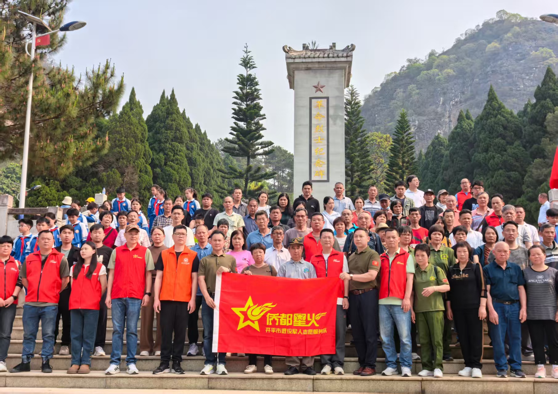 在靖西烈士陵园,全体人员怀着崇敬心情整齐列队,向烈士纪念碑敬献花篮。花篮缎带上“革命烈士永垂不朽”的金色大字与苍翠松柏交相辉映,寄托着对英烈的无限哀思。