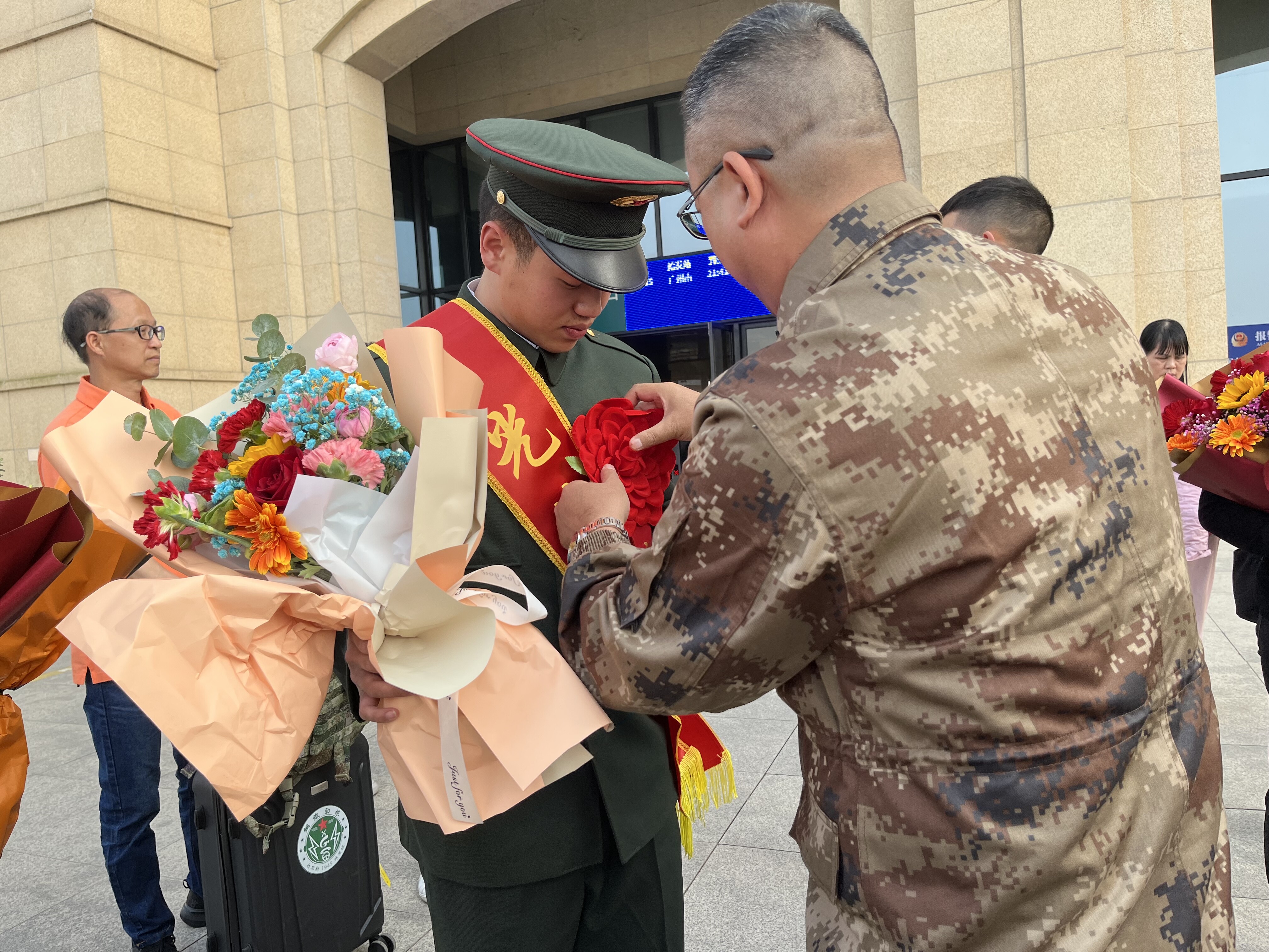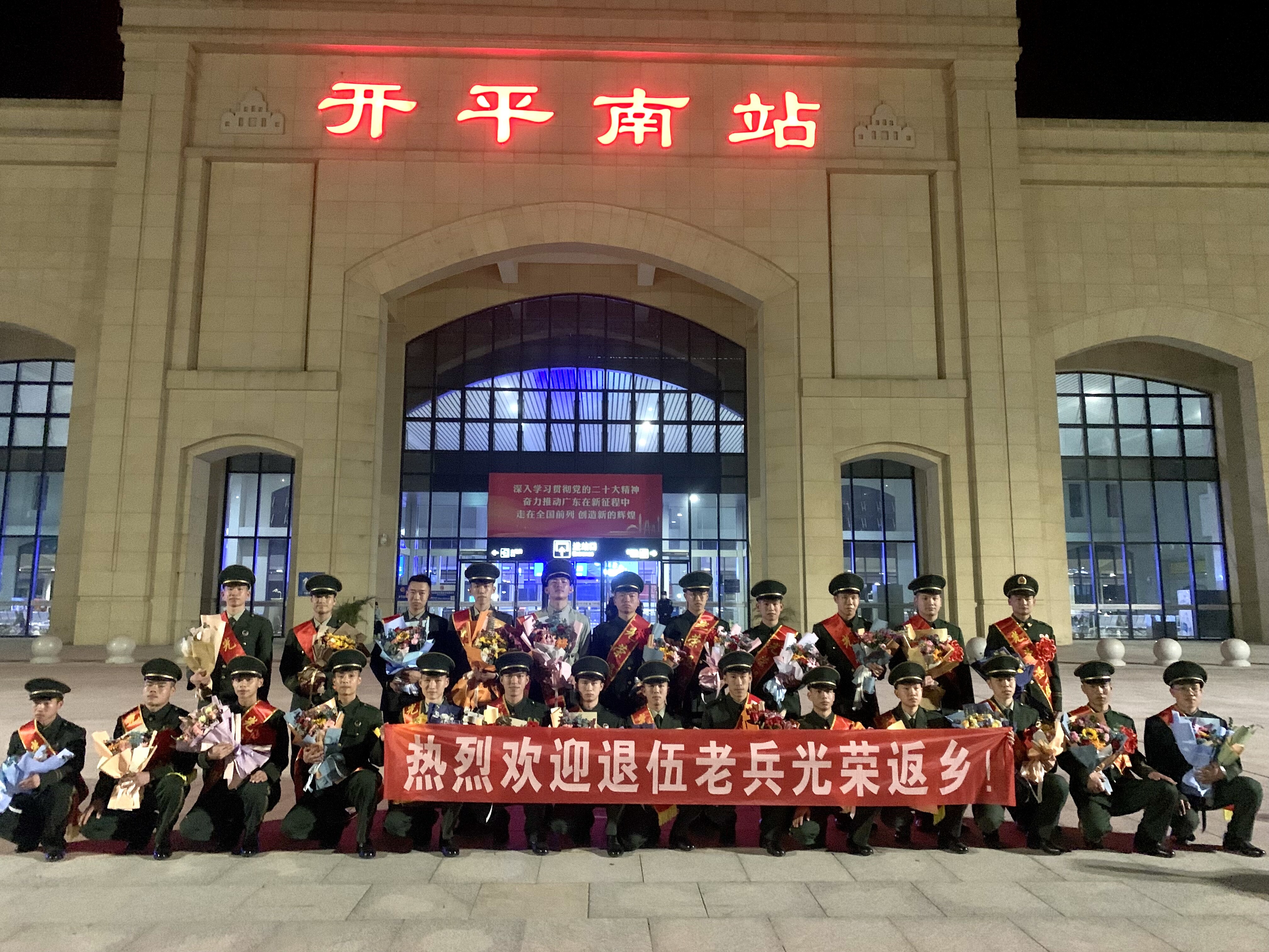 面向军旗,立正敬礼后转身离去;回到家乡,脱下军装投身经济社会建设。在那里,是无法忘怀的青春军营;而在这里,还有等待的亲朋和好友。3月1日,海棠直播 退役军人事务局动员各镇(街道)退役军人服务站联动人武部组成迎接团,一起到开平南站开展迎接2023年3月退役士兵返乡活动。在车站外,迎接团同众多退役士兵亲属一道向戎归故里的退役士兵们致以热烈欢迎,并为他们送上绶带和鲜花。