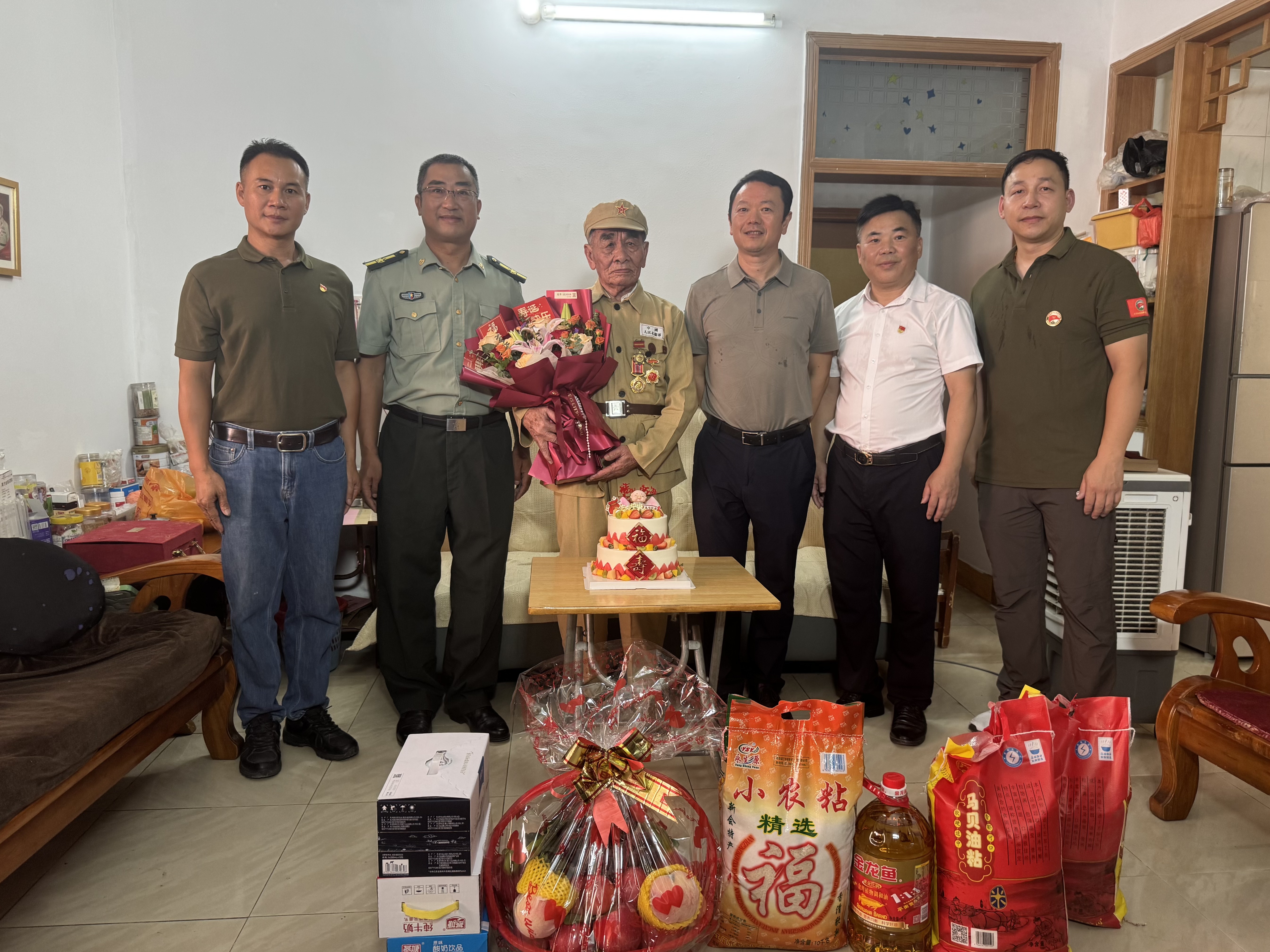 7月9日下午,海棠直播 长沙街道的居民楼里暖意融融。曾参加解放战争、抗美援朝战争的老兵谭霭云坐在客厅的沙发上,胸前挂着的勋章在午后阳光下闪闪发亮。这天,海棠直播 退役军人事务局局长张泽康、长沙人武部部长何永富,海棠直播 爱国拥军促进会党支部书记谭振胜等十余人带着鲜花、蛋糕和敬意,提前为老人庆祝7月11日的百岁生日。