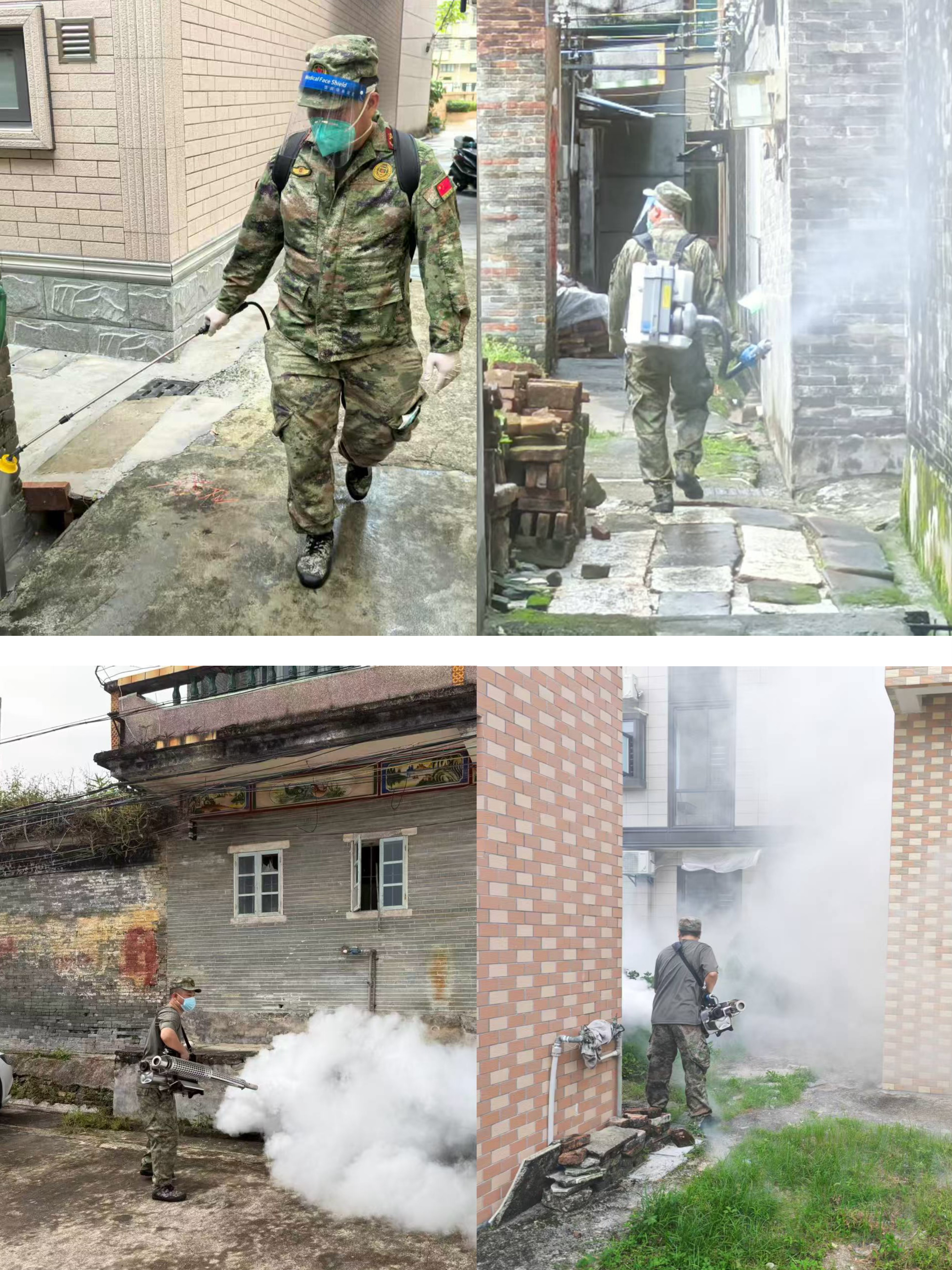 在鹤山某社区消杀现场,民兵队员们身着防护服,背负二十公斤的装备穿梭于狭窄街巷,汗水浸透的迷彩服拧得出水珠,他们日均作业超8小时。民兵连政治指导员华哥表示:“我们24小时轮班作业,已完成12个高风险区域消杀,确保不留死角。”这支由退役军人组成的队伍,生动诠释了“平时服务、急时应急、战时应战”的新时代民兵担当。