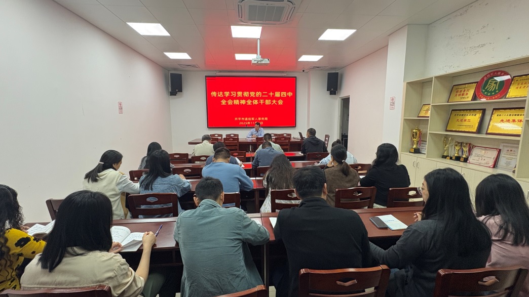 11月5日,市退役军人事务局召开会议学习贯彻党的二十届四中全会精神和习近平总书记重要讲话精神。党组书记、局长张泽康同志主持会议并讲话。局机关和下属单位全体干部职工会议。