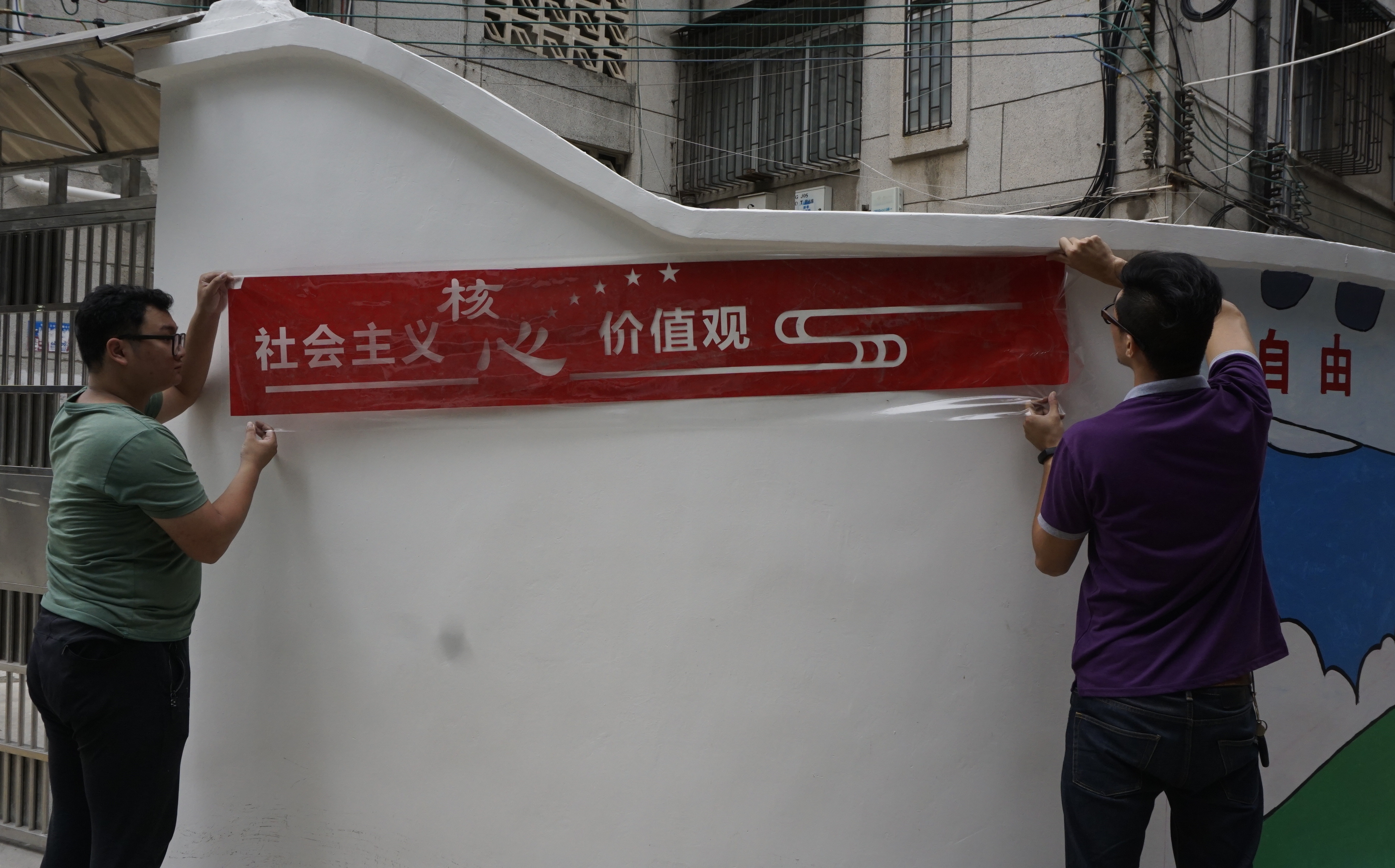 开华路一住宅楼破旧的外墙上正在增加一幅幅别具创意的宣传图画,让“创文”更加深入人心。 10月15日上午,记者在现场看到,文化墙正在进行收尾工作,教师义工为漫画进行添色、修补,并贴上社会主义核心价值观标语。 为深入开展创建全国文明城市活动,市创文办联合市相关部门单位,对该住宅楼外墙进行重新粉刷,并组织忠源纪念中学和教伦中学10多名教师义工,利用节假日,在墙上绘制漫画和标语,历时20天建成这面宣传文化墙。 色彩缤纷的图画配上文字组成的文化墙,令人耳目一新,吸引了不少过往的市民驻足观赏。 通过艺术与文化的氛围来美化街道环境,让墙壁“说话”,让其成为传播文化的新载体、倡导文明的新窗口、广大群众文明素质教育的新阵地,形成人人参与创文,人人共促文明的良好氛围。