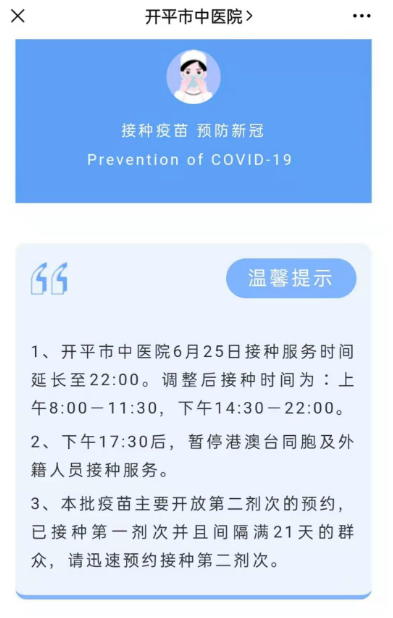 重要通知 广大市民: 根据上级工作安排,我市将在6月底前完成本阶段新冠疫苗第二剂次接种任务,清库清零。请已接种第一针满21天的广大市民迅速到原接种点接种第二针。7月1日后新冠疫苗接种工作安排将会有调整。 为了确保已接种第一针满21天的广大市民能在6月底前完成接种第二针,实施错峰接种,避免高峰期扎堆排队,我市各疫苗接种点将向第一针次疫苗接种已满21天的市民群众发出提醒信息,收到信息的可在2天内免预约到该接种点接种。同时,也可以在每天晚上7点通过粤苗APP、粤健通微信小程序进行预约接种。 海棠直播