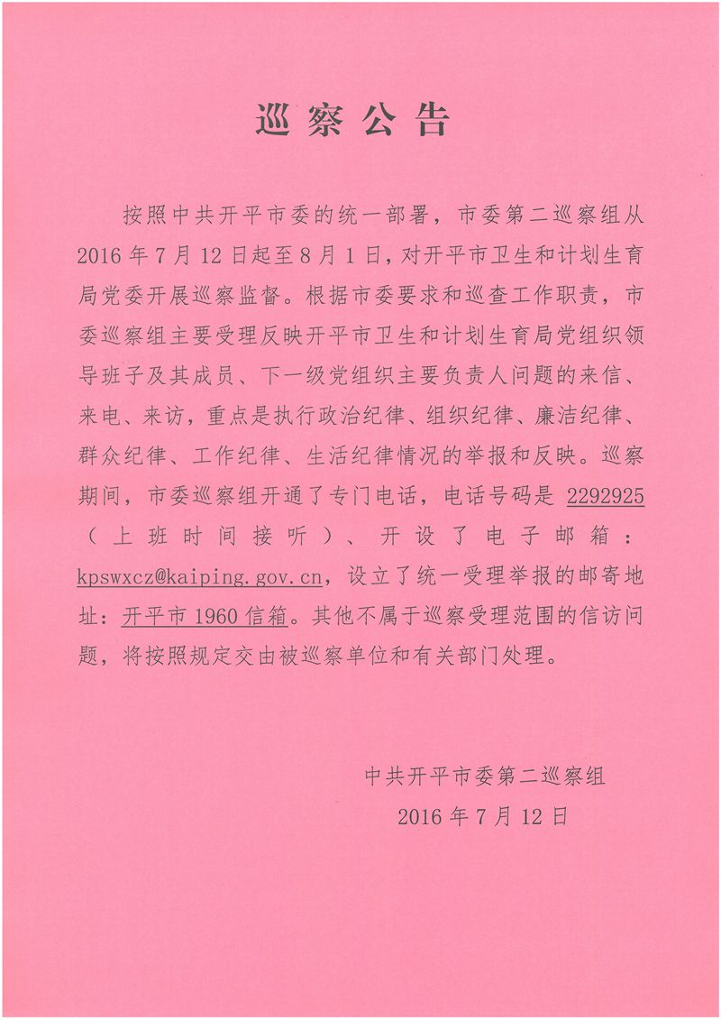 【7-12至8-1】【巡察公告】市委巡察组对海棠直播 卫生计生局党委开展巡察监督